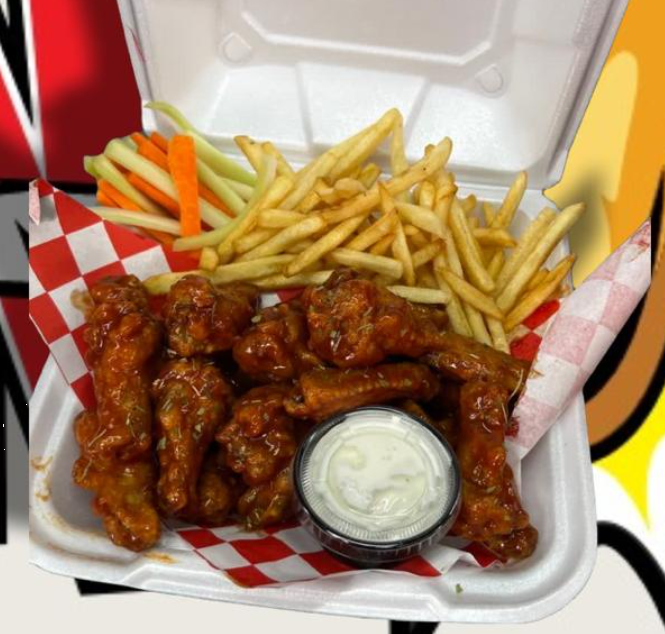 1 Orden de alitas, papas a la francesa, soda, zanahoria, apio y ranch.