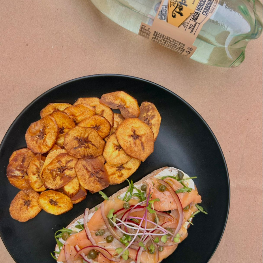 Toast de Salmon con Ponzu*1 + Chips de Platano Macho*1 + Agua Mineral Topochico*1