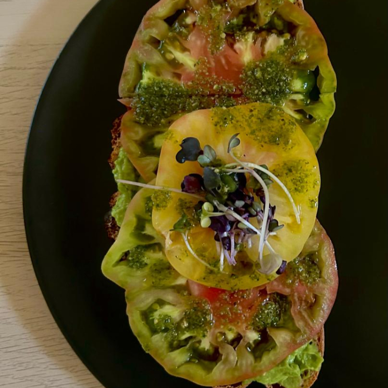 Aguacate, tomate heirloom, pesto verde y aceite de oliva.