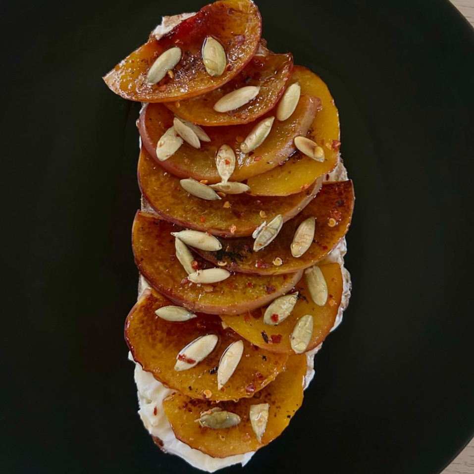 Jocoque, durazno, miel de agave, chili flakes, pepitas de calabaza.