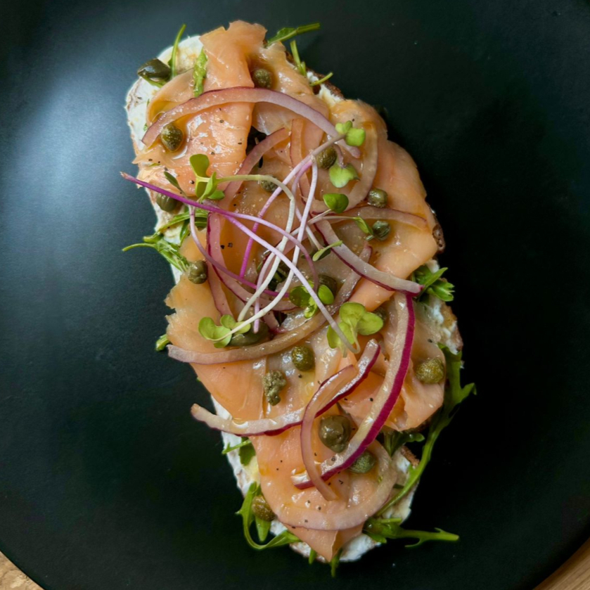 Queso crema, arugula, salmon ahumado, alcaparras, cebolla morada, ponzu y aceite de oliva.