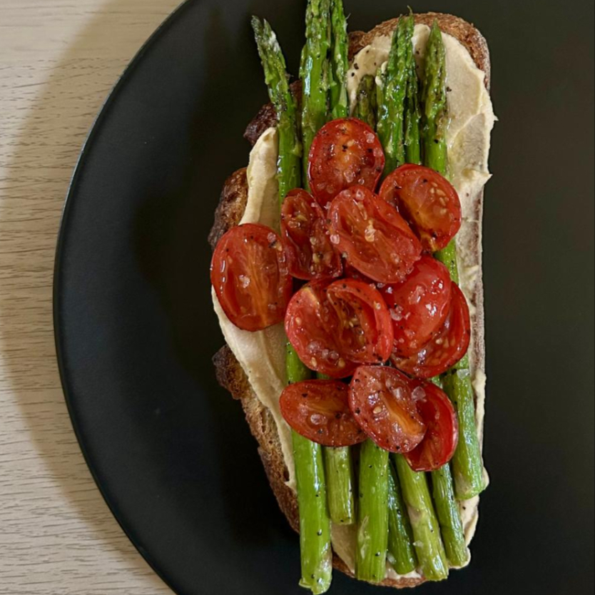 Humus de garbanzo, aceite de oliva, espárragos, tomate cherry, sal y Pimienta