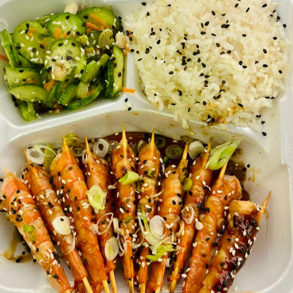 Proteína a la plancha bañada en salsa teriyaki con top de ajonjolí, acompañada de ensalada de pepino, jícama y zanahoria y arroz blanco al vapor.