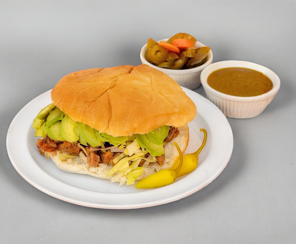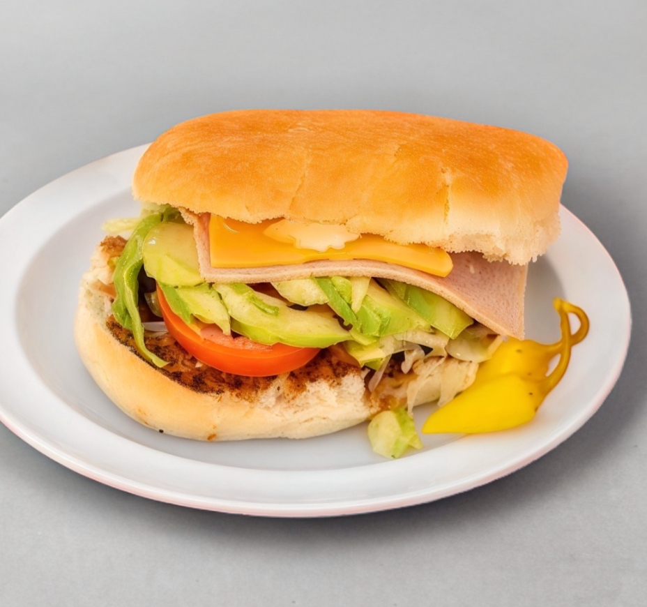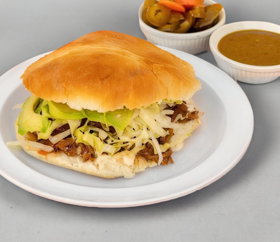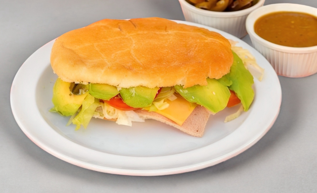 Para una persona. Con 2 carnes: Deshebrada, Bistec ranchero, jamón y queso. (Tomate, lechuga, aguacate y mayonesa)