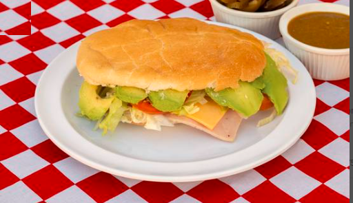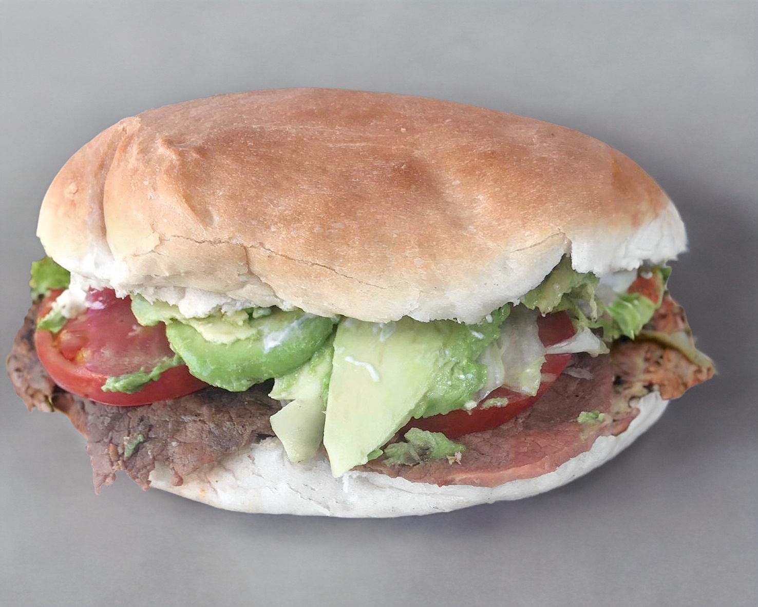 Torta de lomo preparada con aguacate, mayonesa, lechuga y tomate.