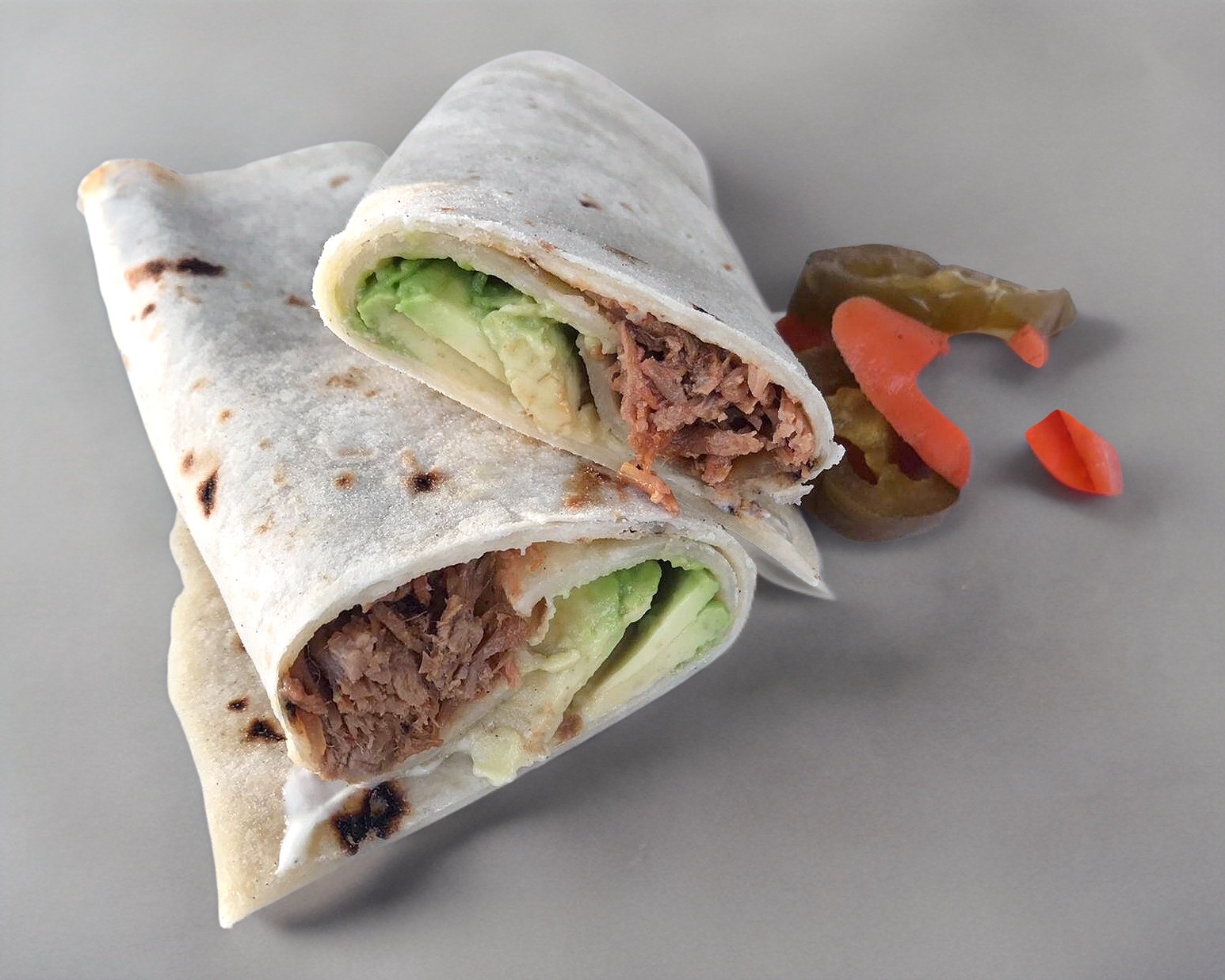 Burrito de frijol con carne deshebrada, mayonesa y aguacate.