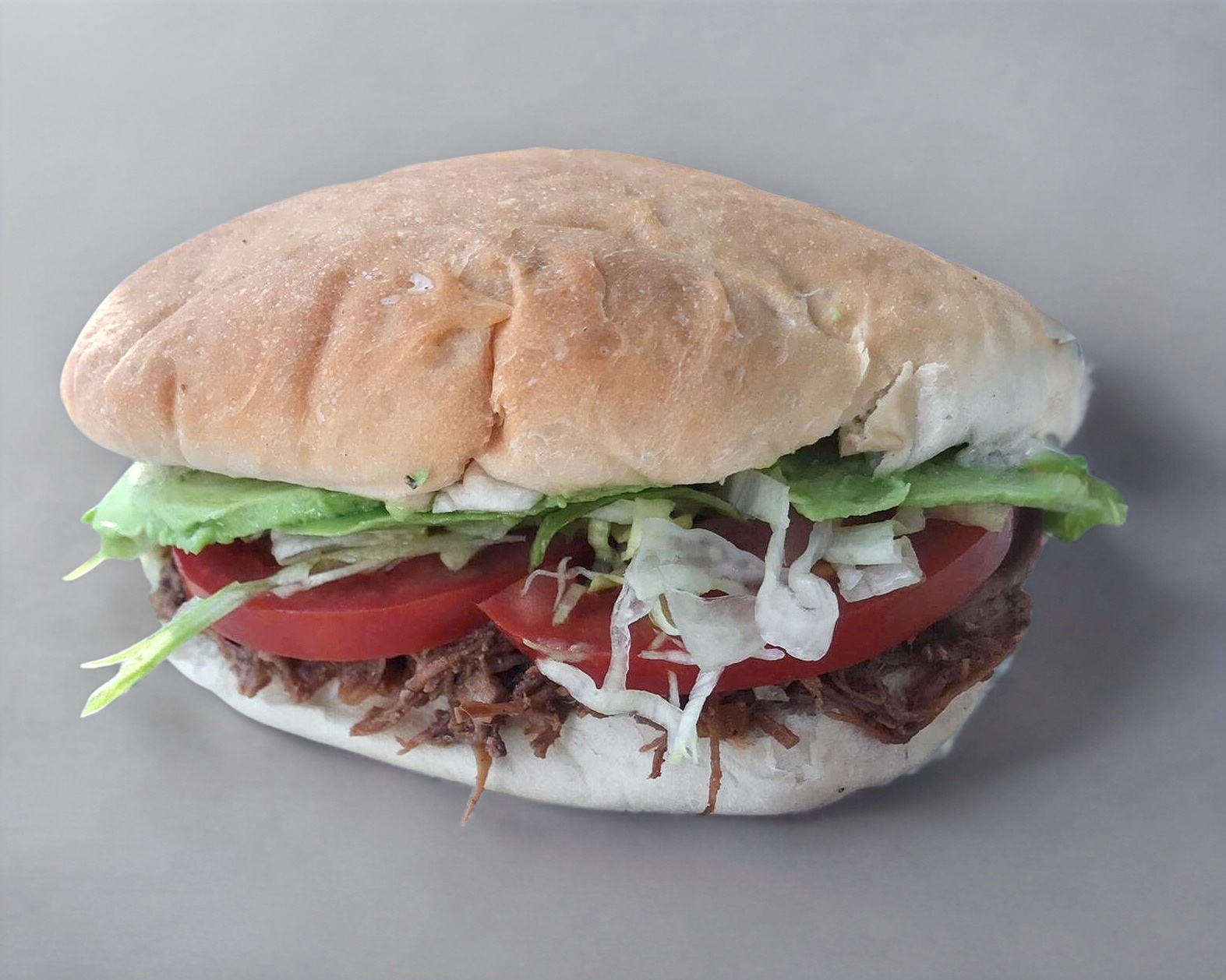 Torta de carne deshebrada preparada con aguacate, mayonesa, lechuga y tomate.