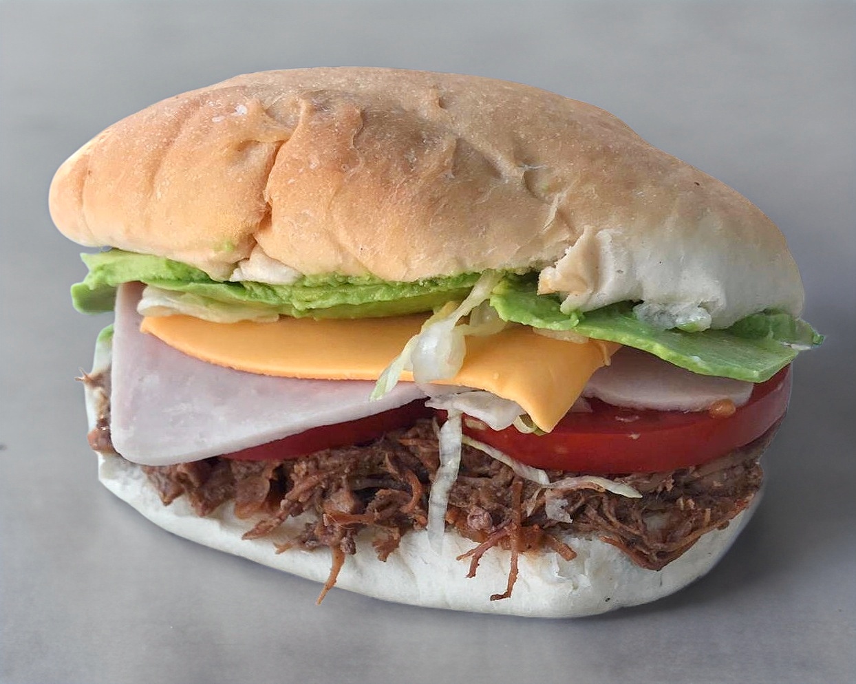 Torta de jamon y queso con dos carnes, preparada con aguacate, mayonesa, lechuga y tomate.