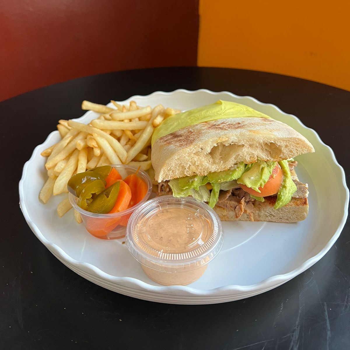 Lomo de res, deshebrada, jamón de pavo y queso amarillo. Aguacate, tomate, lechuga y mayonesa.