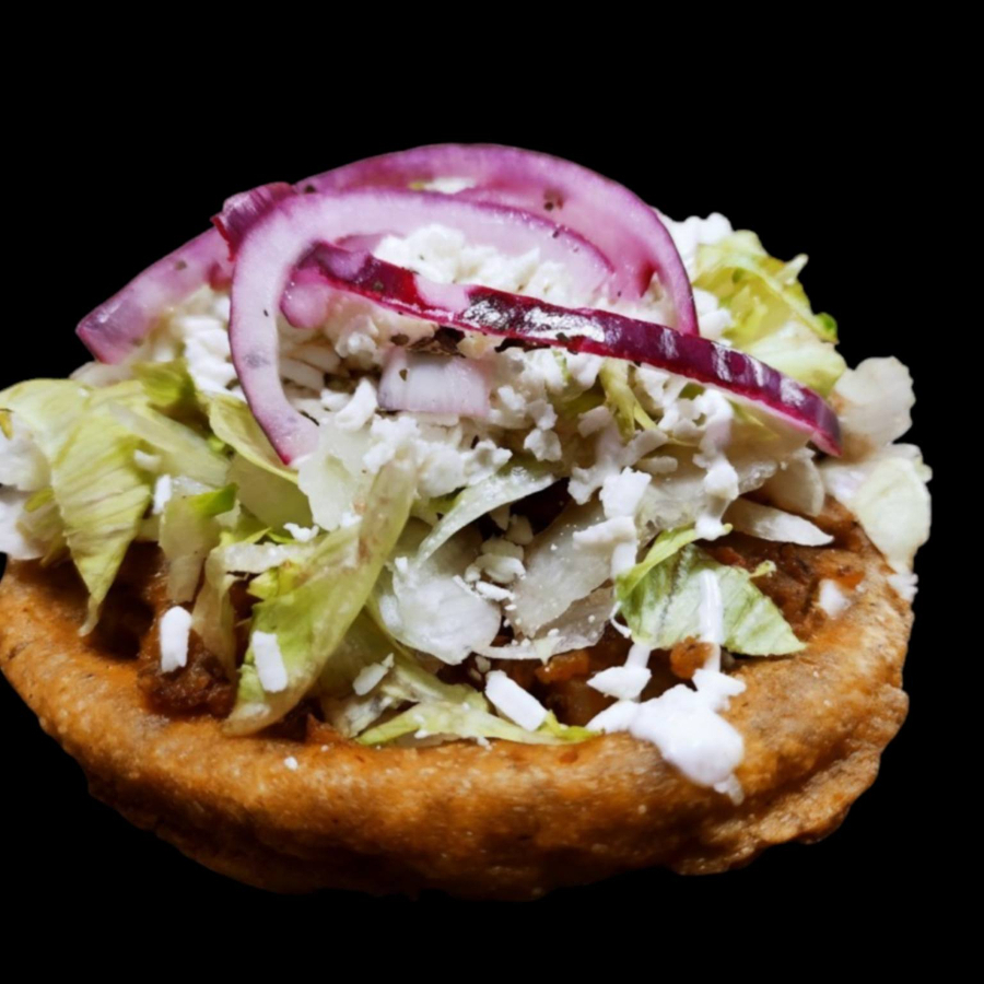 Sopes de masa de nixtamal, rellenos de picadillo casero bien sazonado, con ingredientes a elegir