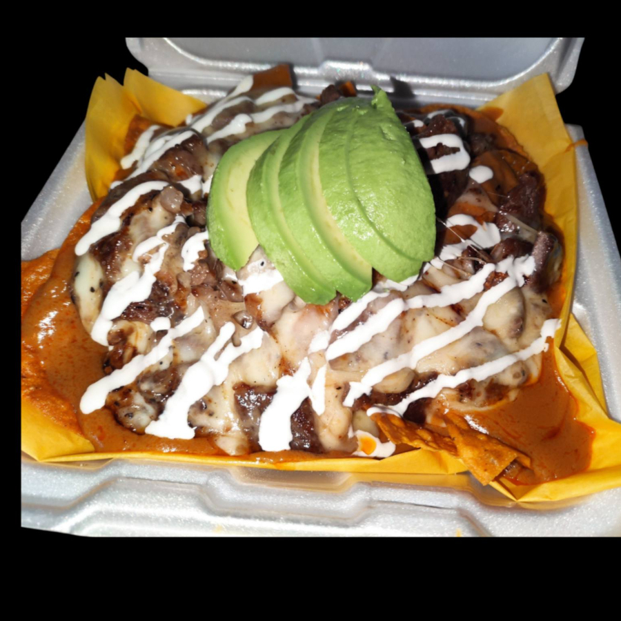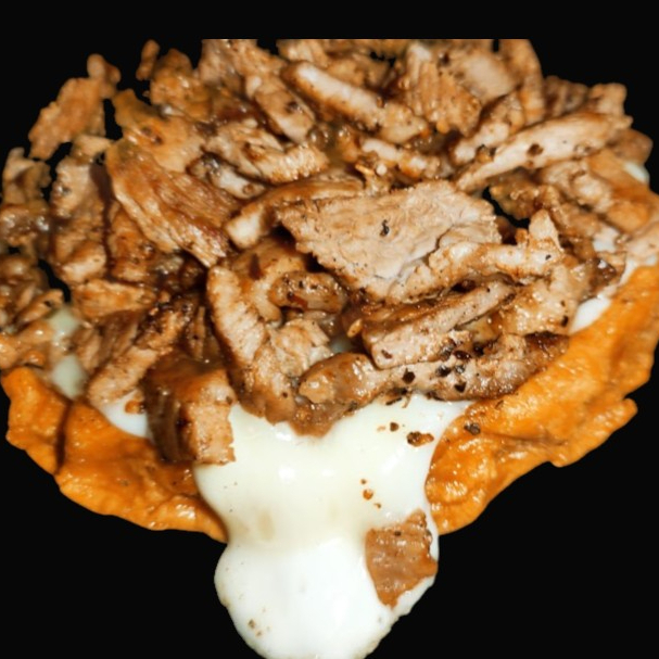 Totopos caseros, queso de nacho, 150gr de carne de asada con 100gr de queso mozzarella, crema y aguacate!