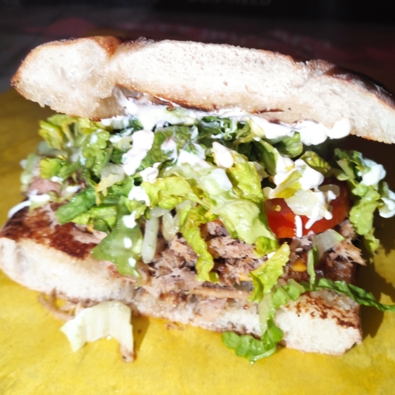 Torta de pan Artesanal con masa madre y 150 gr Aprox de New York Steak sazonado e ingredientes a elegir.