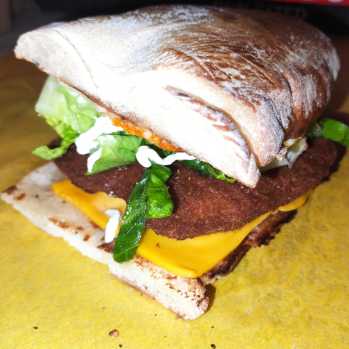 Pan Artesanal de masa madre con mantequilla a la plancha y milanesa de pollo.
