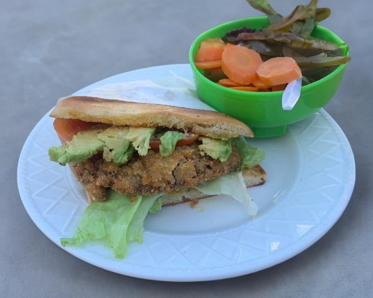 Milanesa empanizada frita, con queso blanco o amarillo mayonesa, aguacate, tomate y lechuga