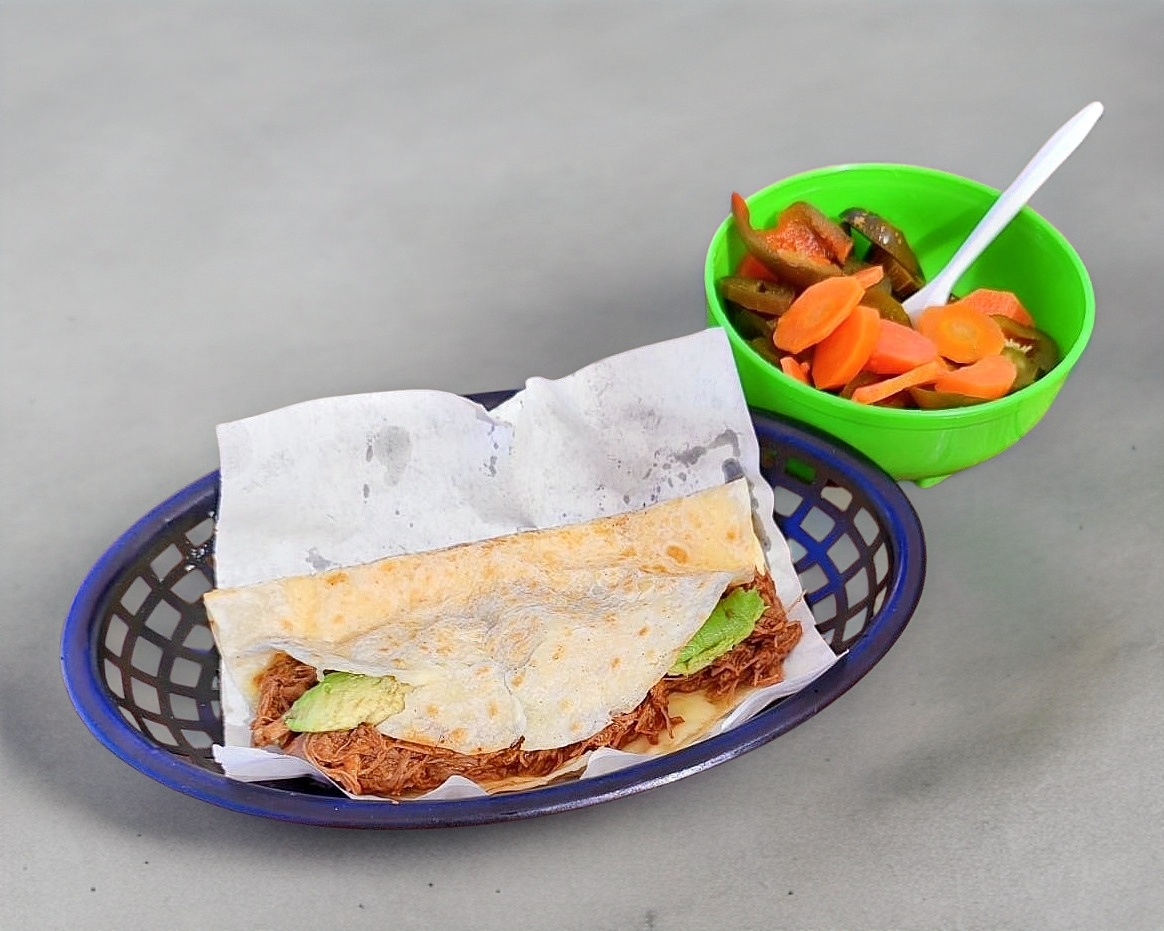 Queso blanco monterrey, carne asada o deshebrada y aguacate