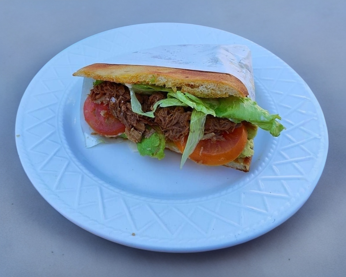 Carne deshebrada, mayonesa, aguacate, tomate y lechuga