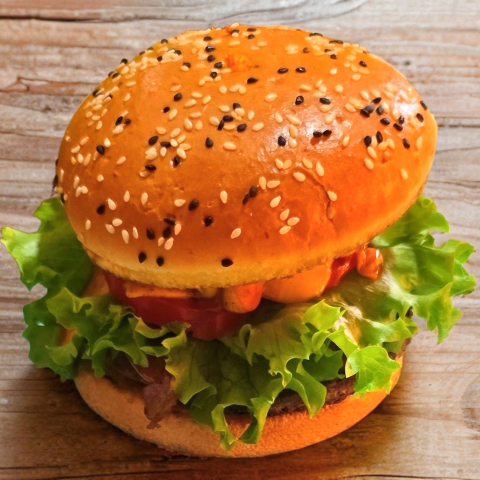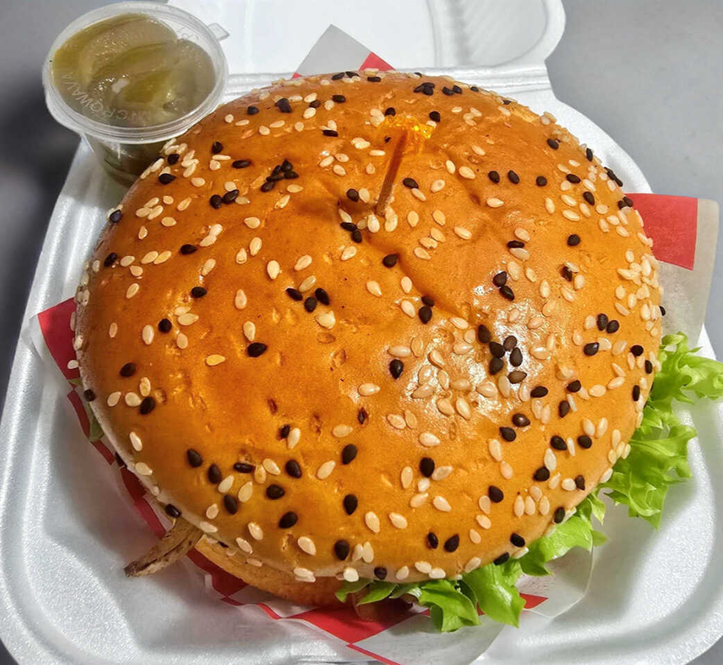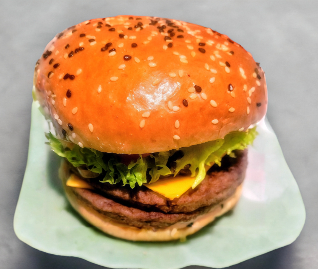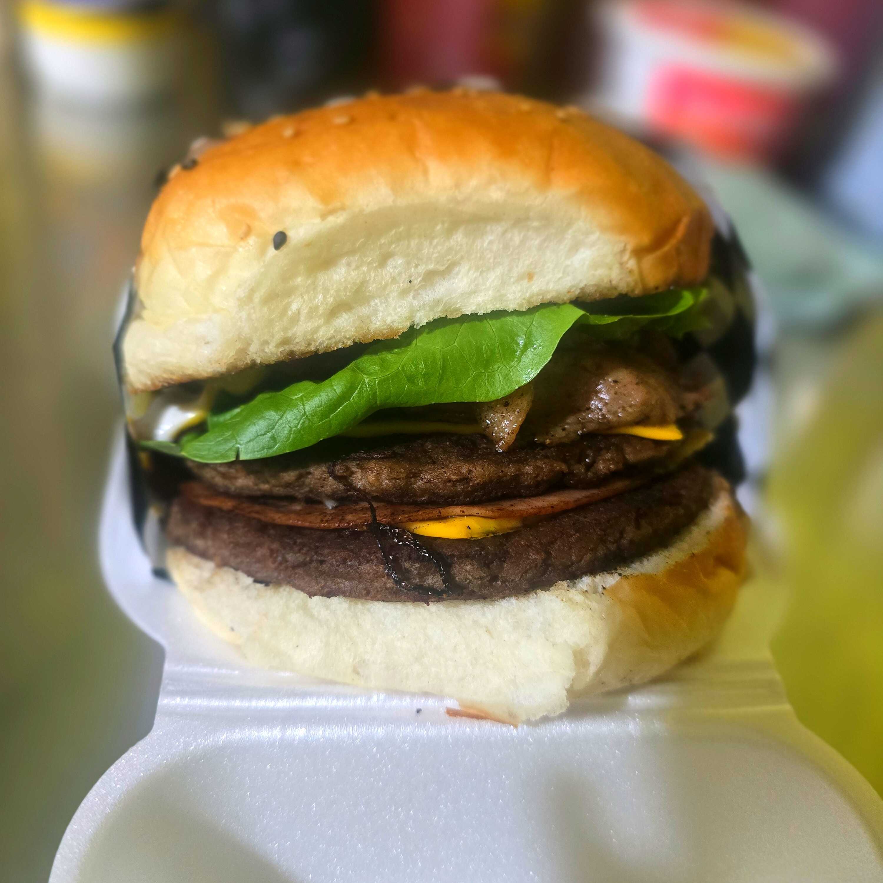 Doble carne de res , aderezada con bbq oh bufalo , lechuga , tomate , cebolla cruda , mayonesa , mostaza y capsu