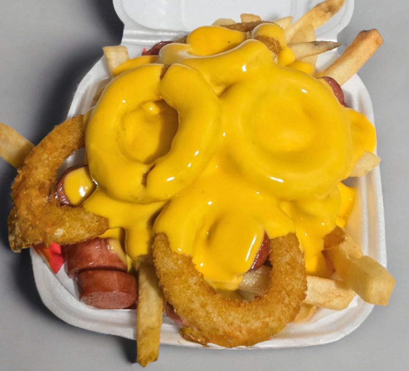 Papas fritas , salchichas, boneles y aros de cebolla con BBQ oh BUFALO con queso de nachos y aderezo chipotle