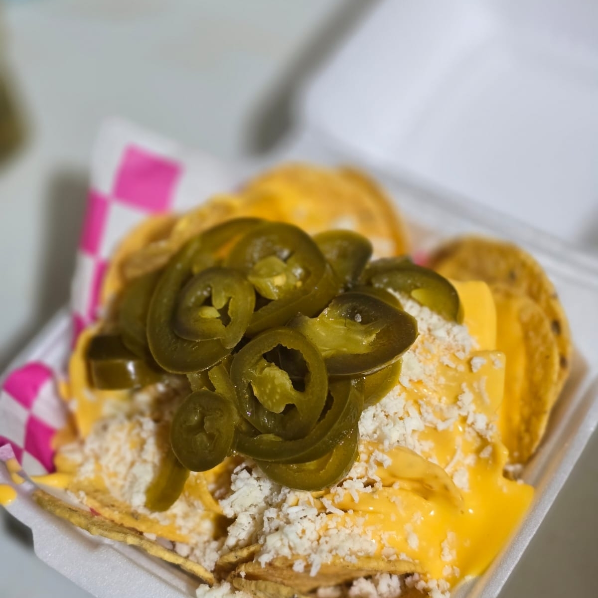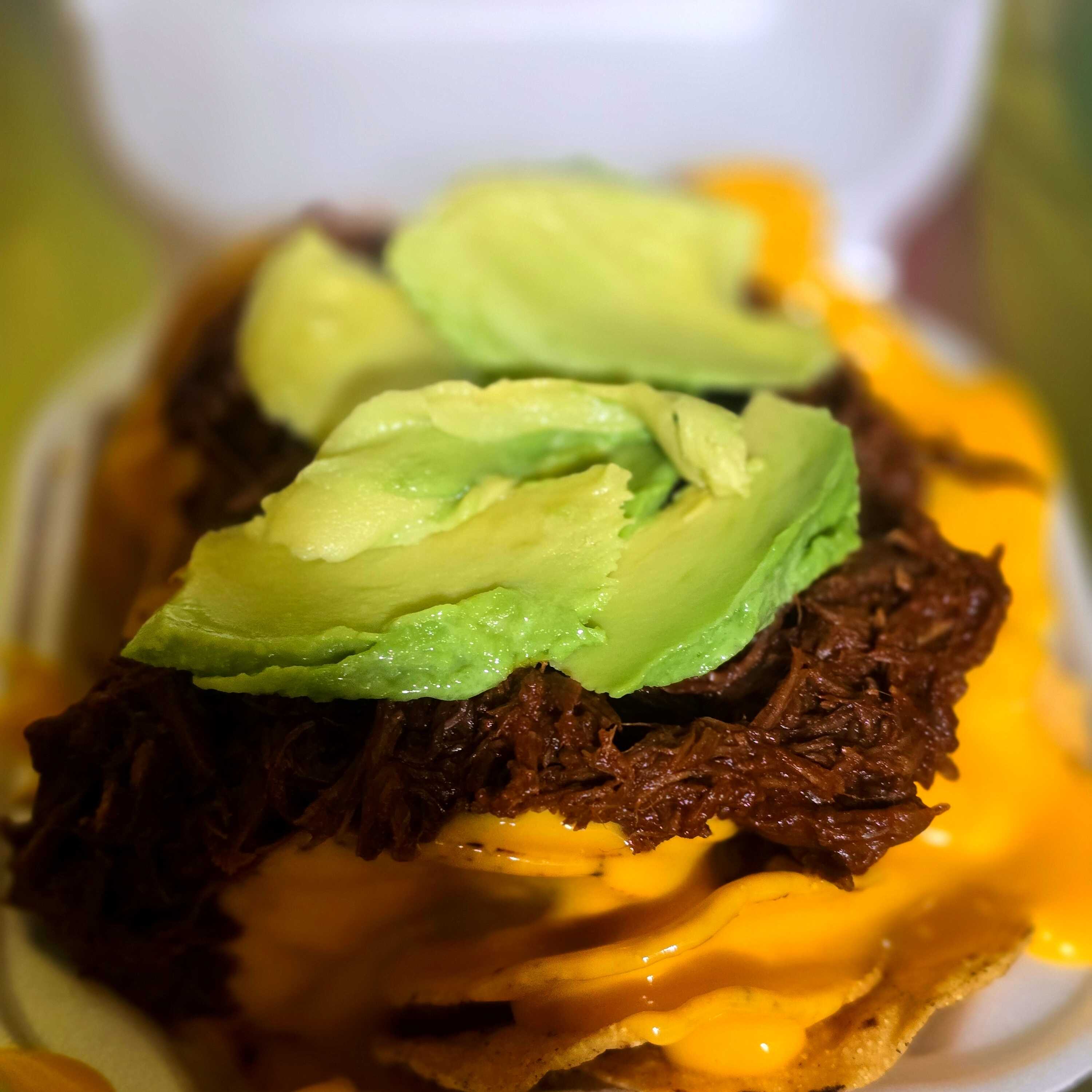 totopos, banados de queso chedar,carne deshebrada y aguacate