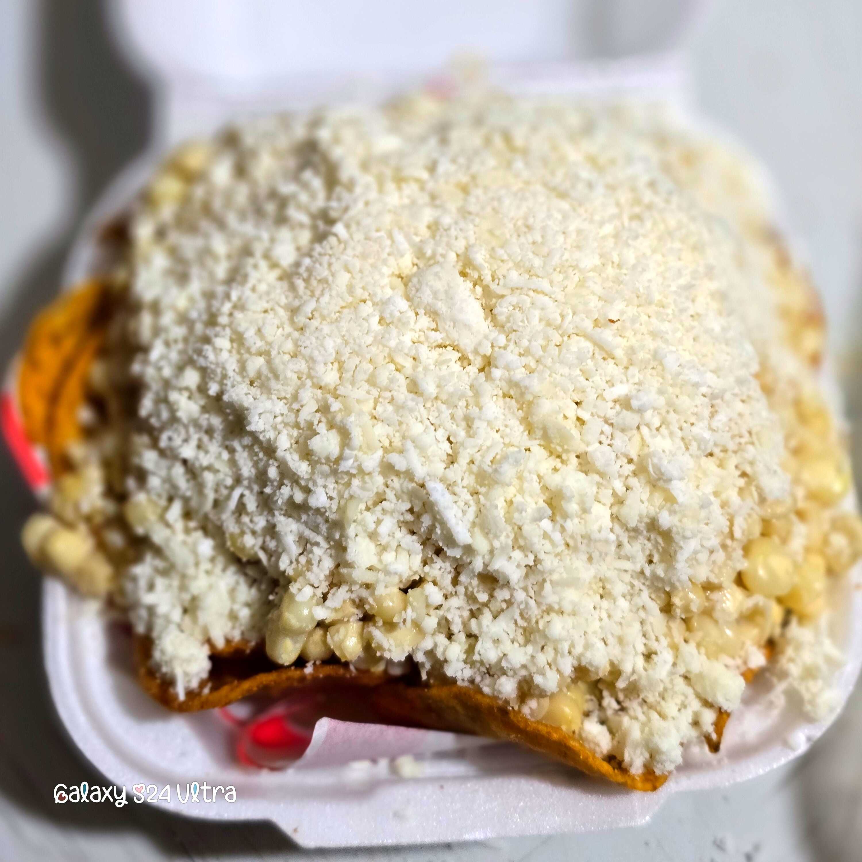charolita , tostitos verdes oh morados , elote , mantequilla, mayonesa , limon , sal y queso rayado , salsa , chamoy , salsa, chamoy con tajin