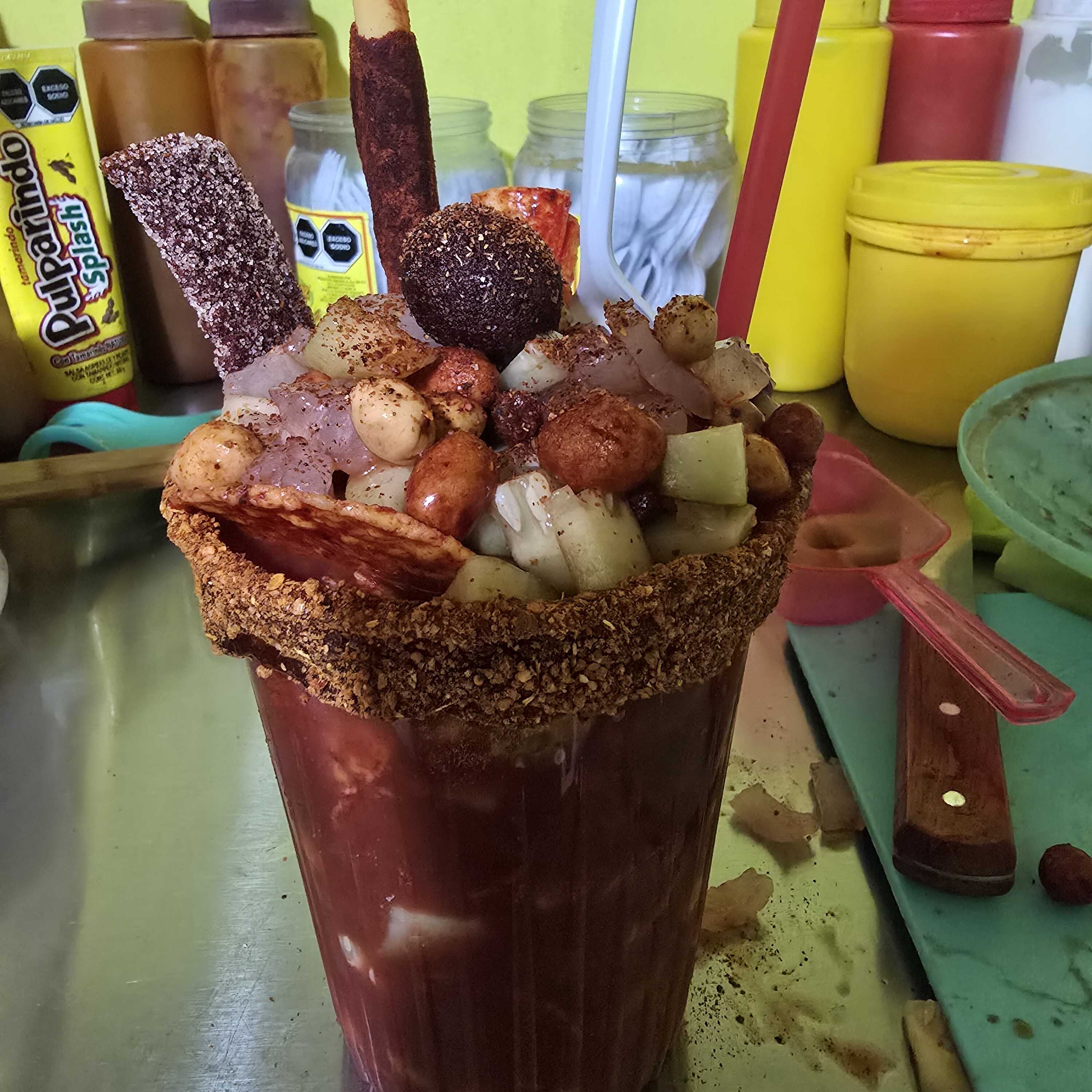 tostitos verdes oh morados ,pepino,cueritos,cacahuates,churritos,cacahuates hotnuts rielitos,chamoy,salsa,tajin,limon,bolita de tamarindo y clamato todo en un vaso de litro