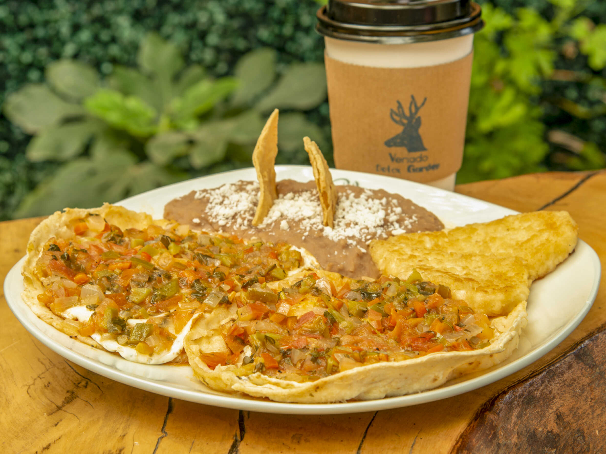 Totopos en salsa de frijol acompañados con 2 huevos estrellados ó revueltos y papa rallada. Incluye una bebida, café, té ó naranjada.