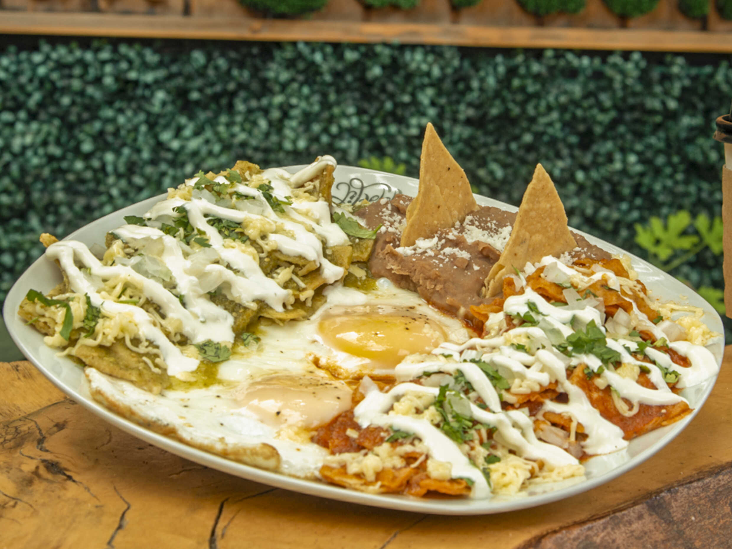 Totopos en salsa roja ó verde con queso, cebolla, crema y cilantro acompañados de frijol.