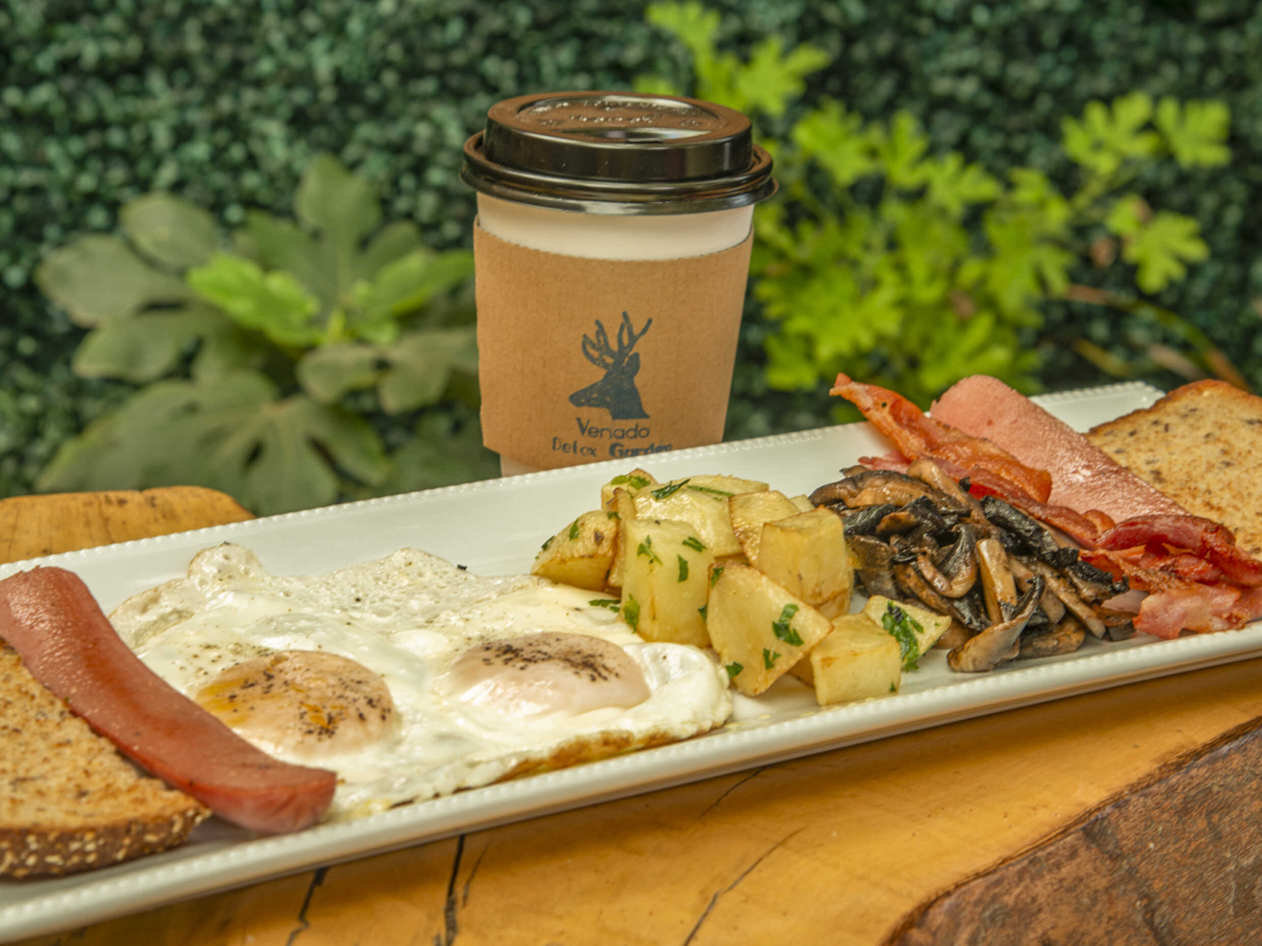 2 huevos estrellados, pan tostado, salchicha, tocino, champiñones y batata jarra ( papa en cubo salteada con perejil)