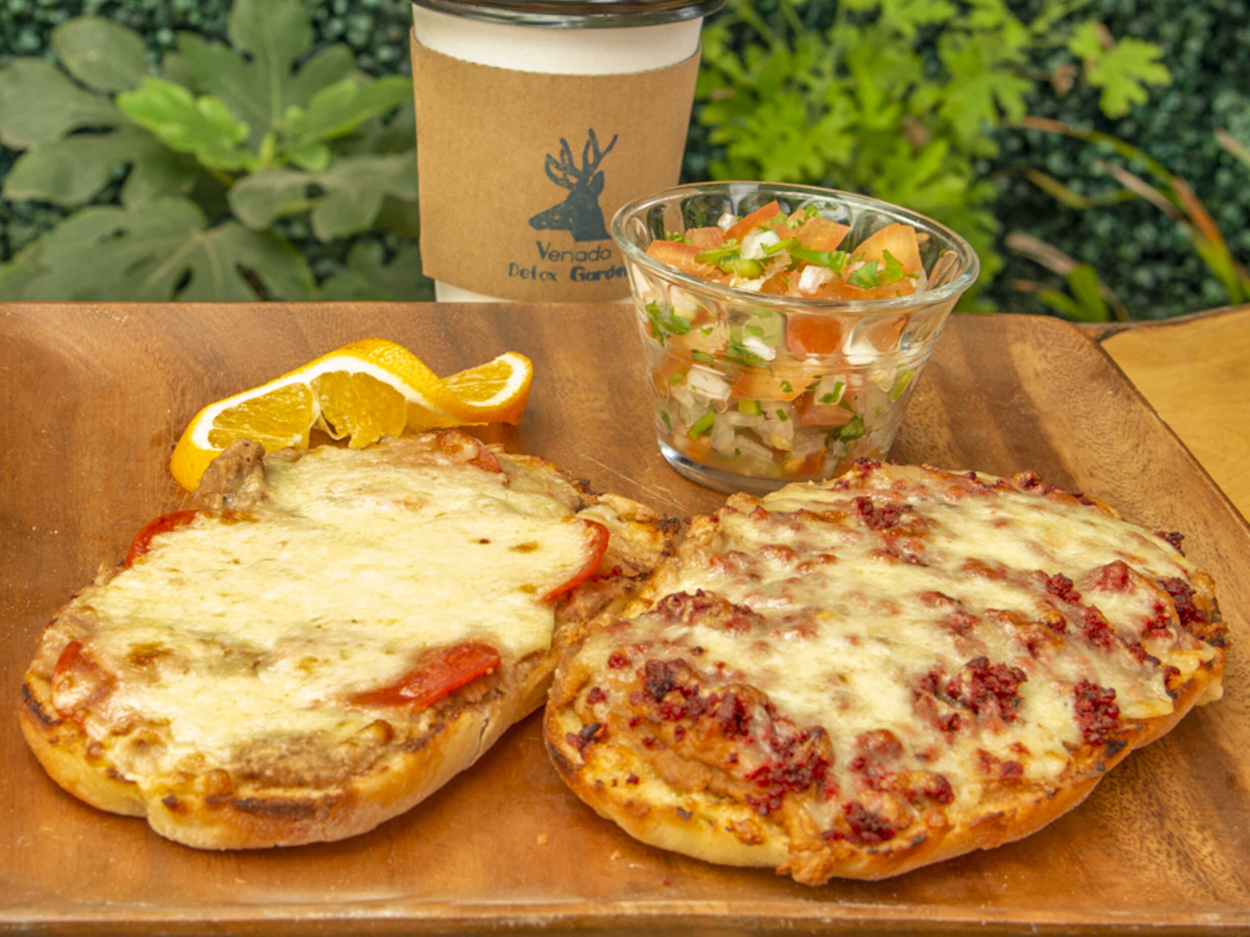 2 piezas frijol y queso con chorizo o pepperoni, acompañado de salsa mexicana.