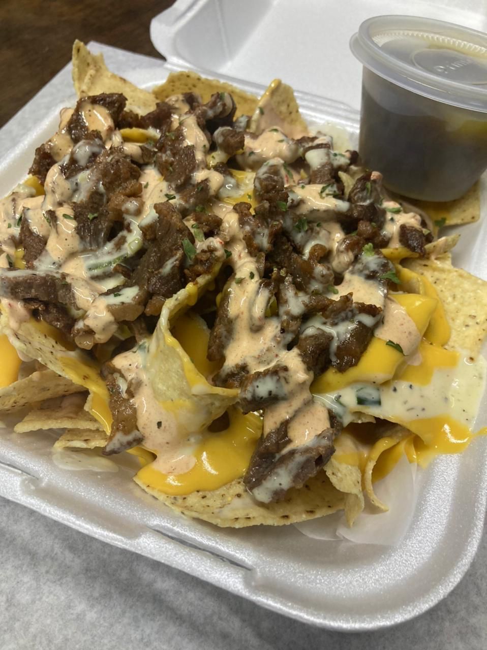 Cama de papas, arriba salchicha Longmont, bañadas de queso amarillo, aderezo ranch, aderezo chipotle y un toque de perejil.