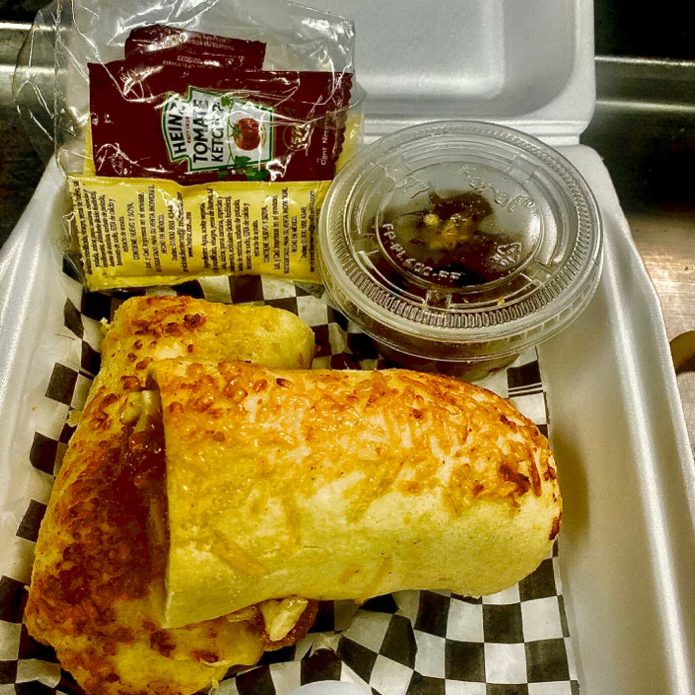 Pan brionch pollo empanizado en salsa que guste queso y tocino