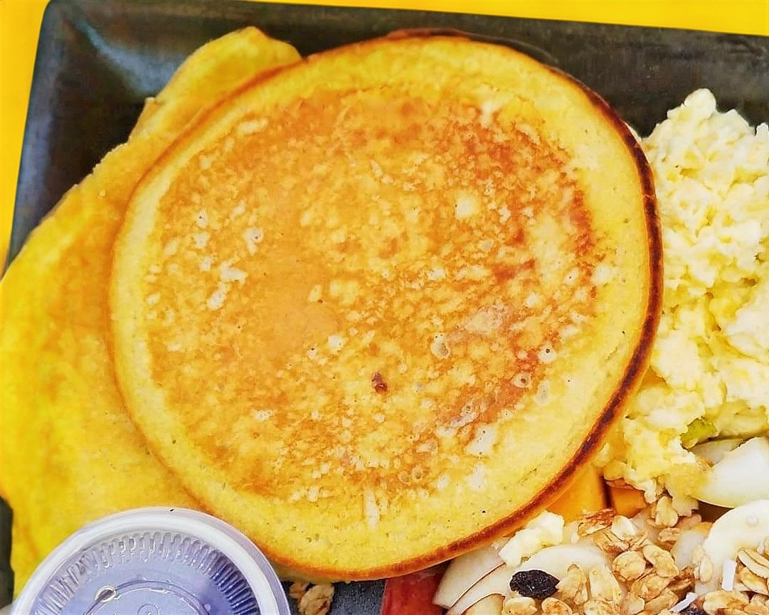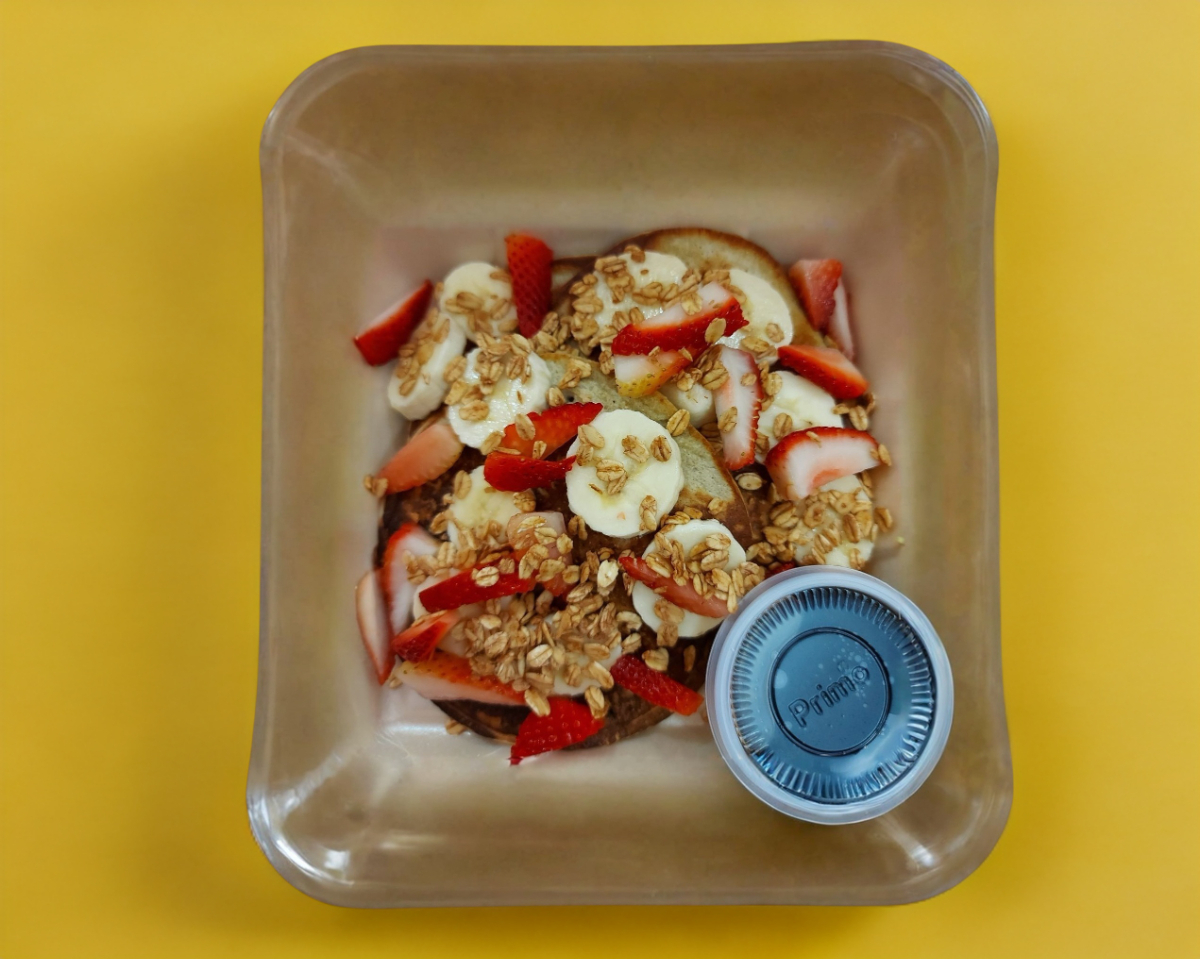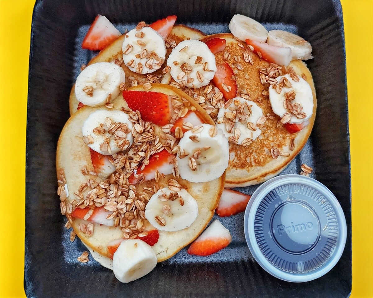 (3pzs) Hot-cakes acompañado de fruta, granola y miel.