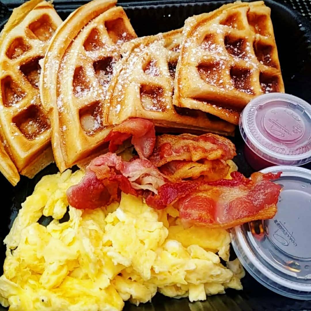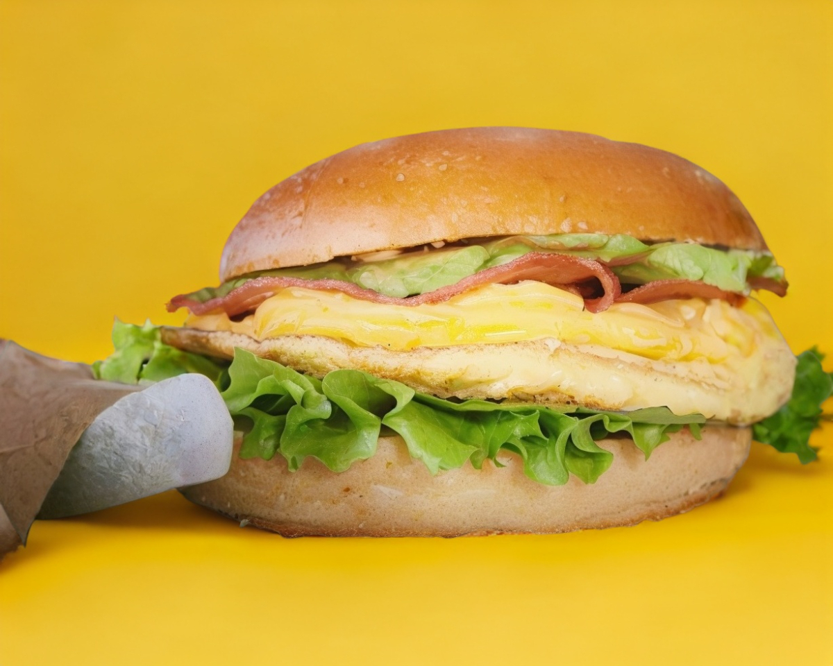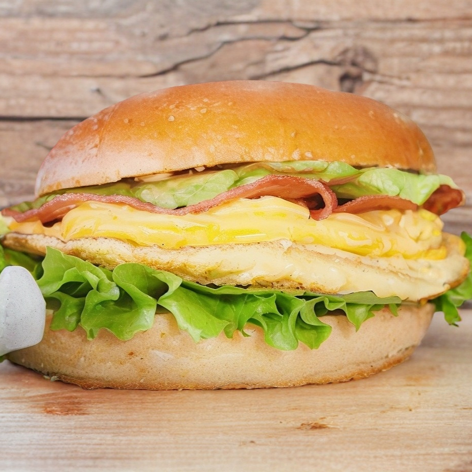 Huevo revuelto, tocino, jamón de pavo, queso americano, aguacate y lechuga.
