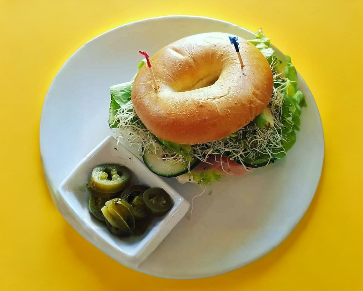 Jamón de pavo, queso panela, lechuga, tomate, pepino, aguacate y alfalfa.
