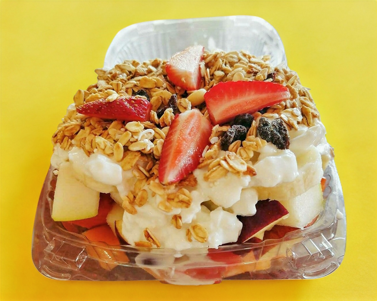Manzana, pera, melón, papaya, plátano, granola, miel de abeja, con queso cottage o yogurt natural.
