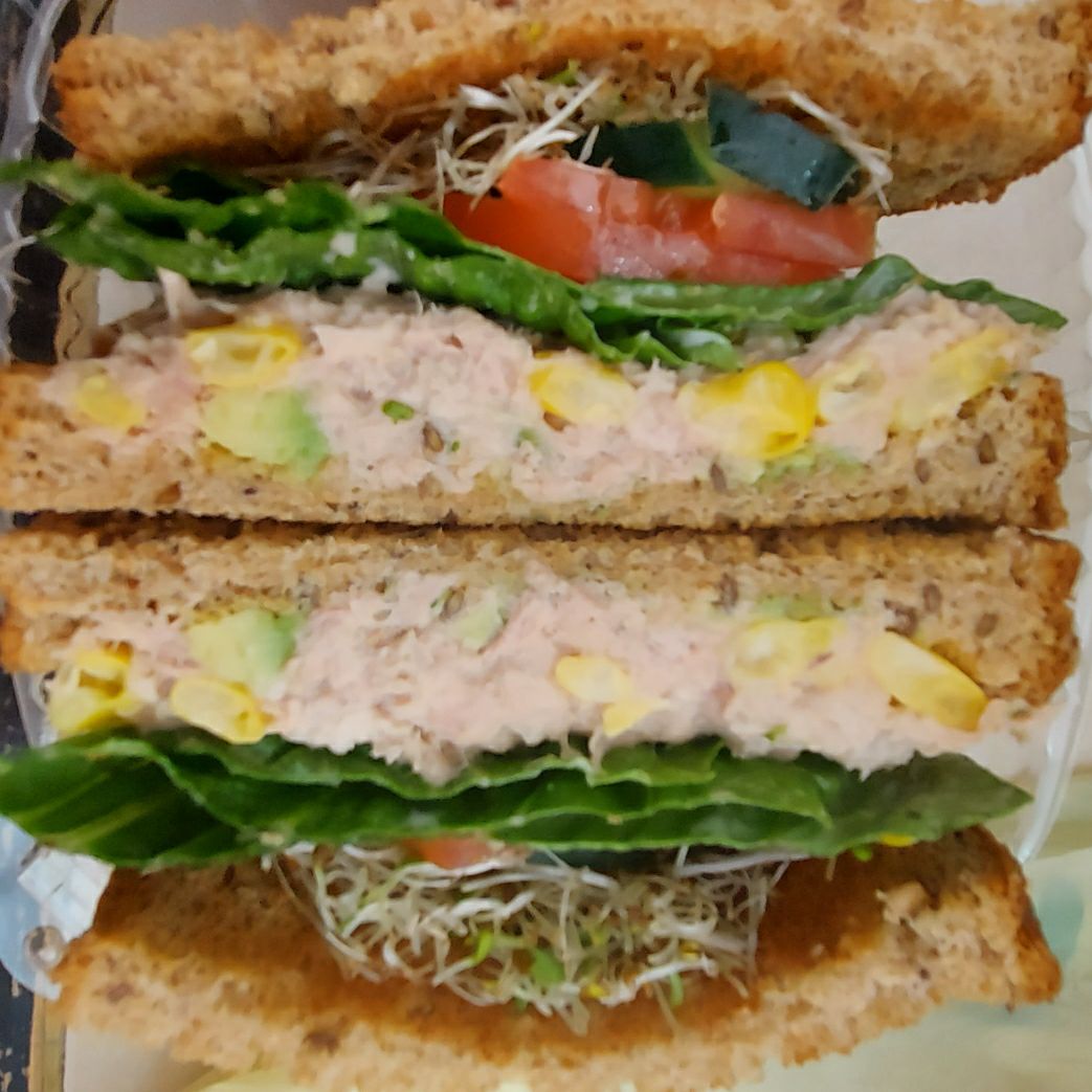 Pan de 12 granos, jamón de pavo, queso panela. lechuga, tomate. pepino, aguacate y alfalfa.