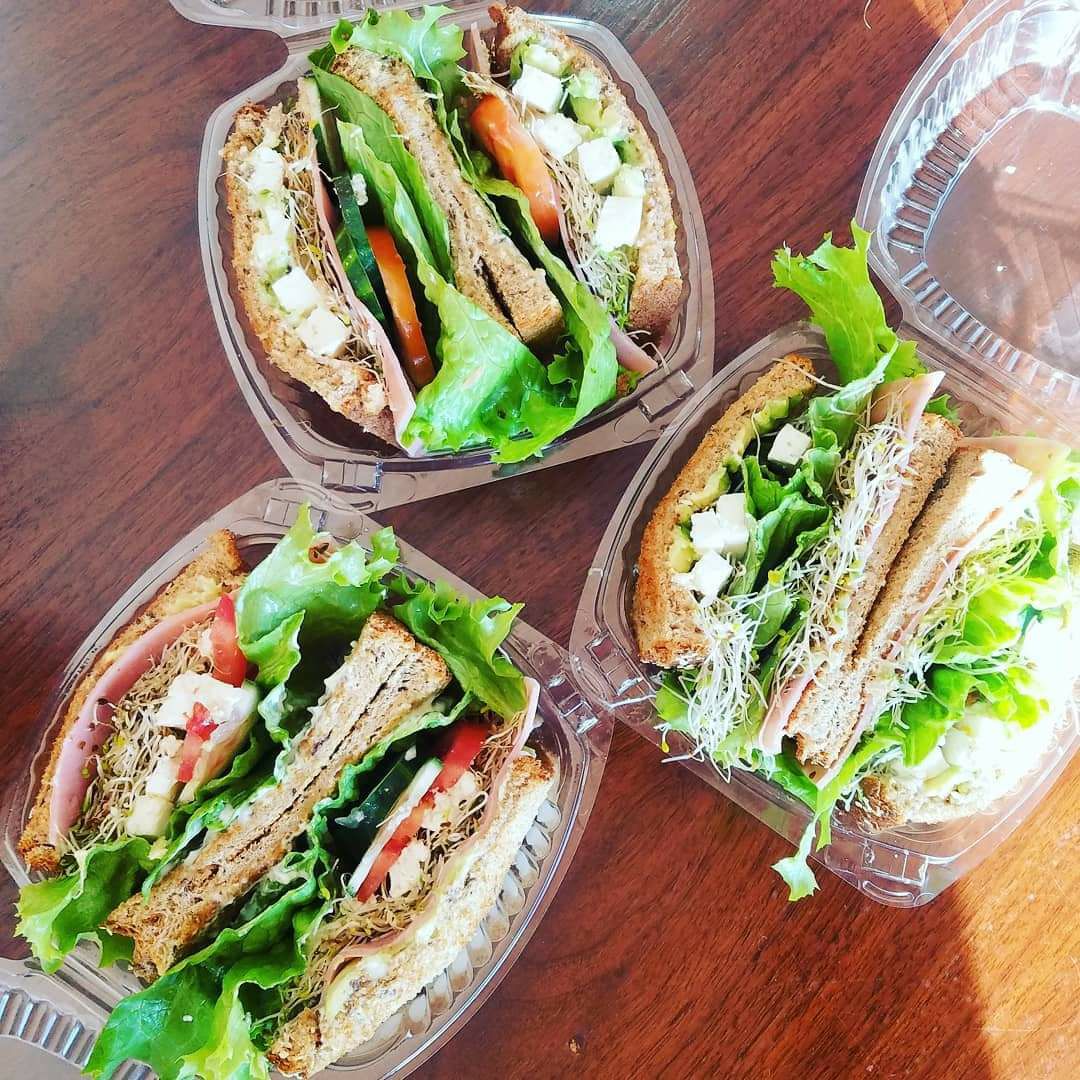 Pan 12 granos, jamón de pavo, queso panela, lechuga, tomate, pepino, aguacate y alfalfa.