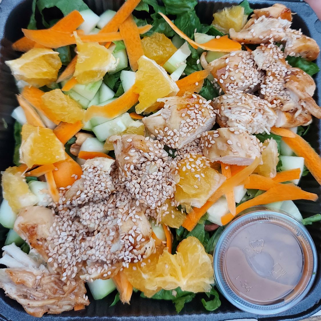 Lechuga, pechuga de pollo marinada en aderezo asiático, zanahoria, naranja, pepino, cacahuates, ajonjolí y aderezo asiático.