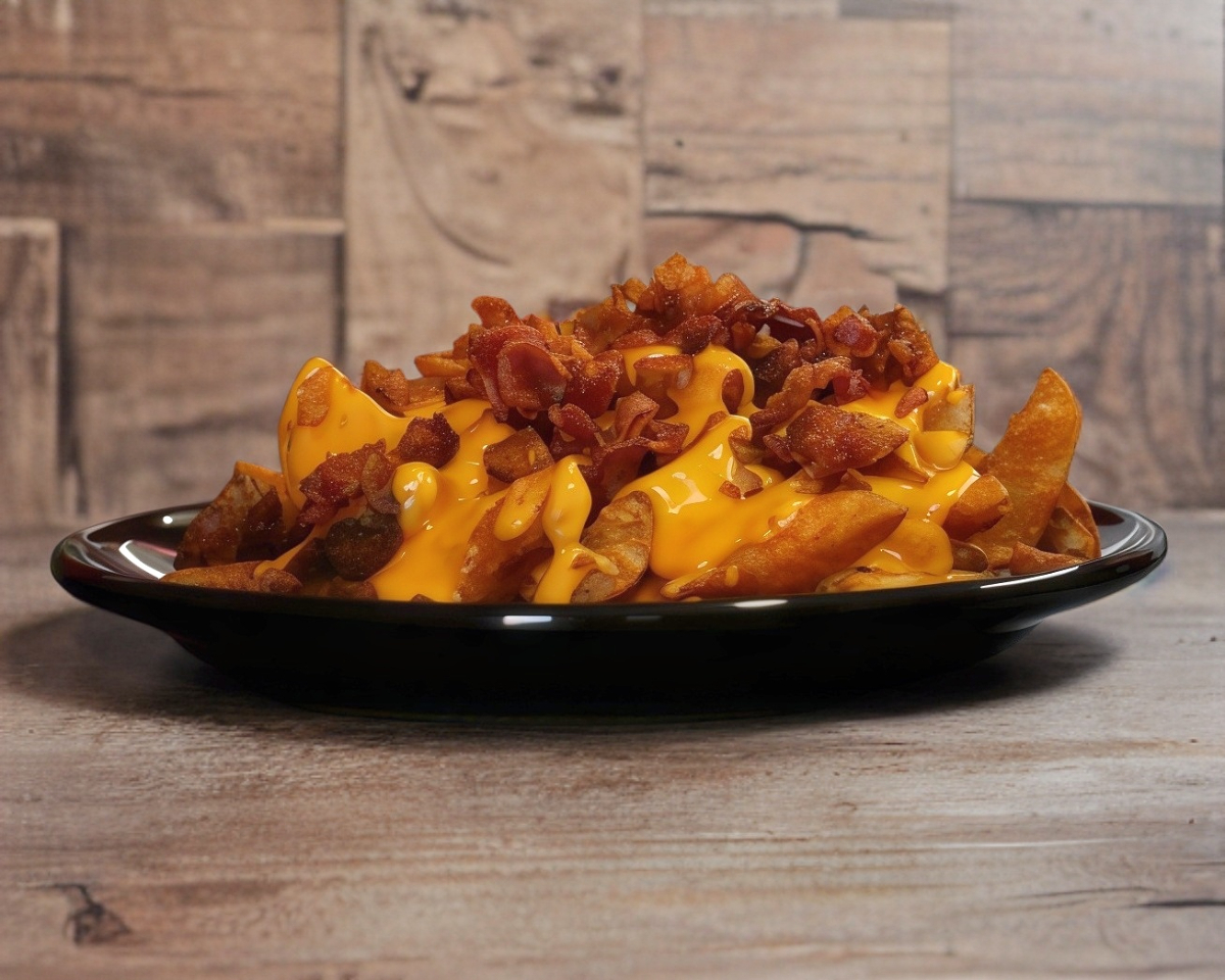 Papas sazonadas con queso para nachos y tocino.