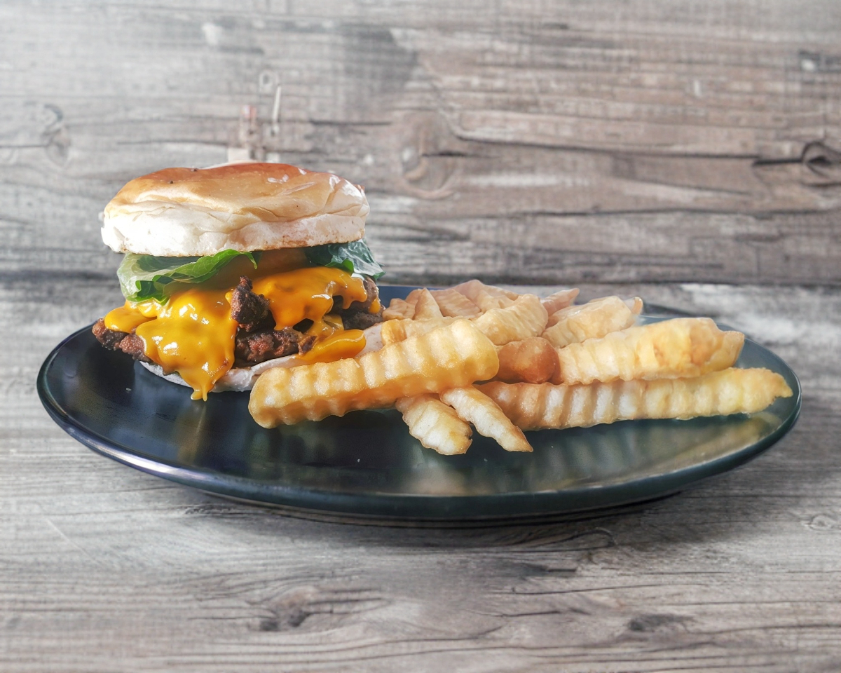 Carne de res, queso, aros de cebolla, verduras, aderezos, tocino y salsa BBQ.