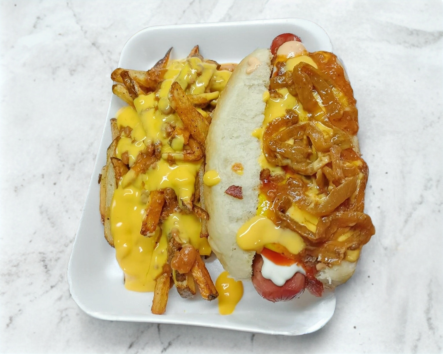 Pan de la casa, Salchicha Jumbo rellena de Queso Chédar y envuelto en tocino, Toppings a elegir, aderezo a elegir, Acompañado de Papas Fritas