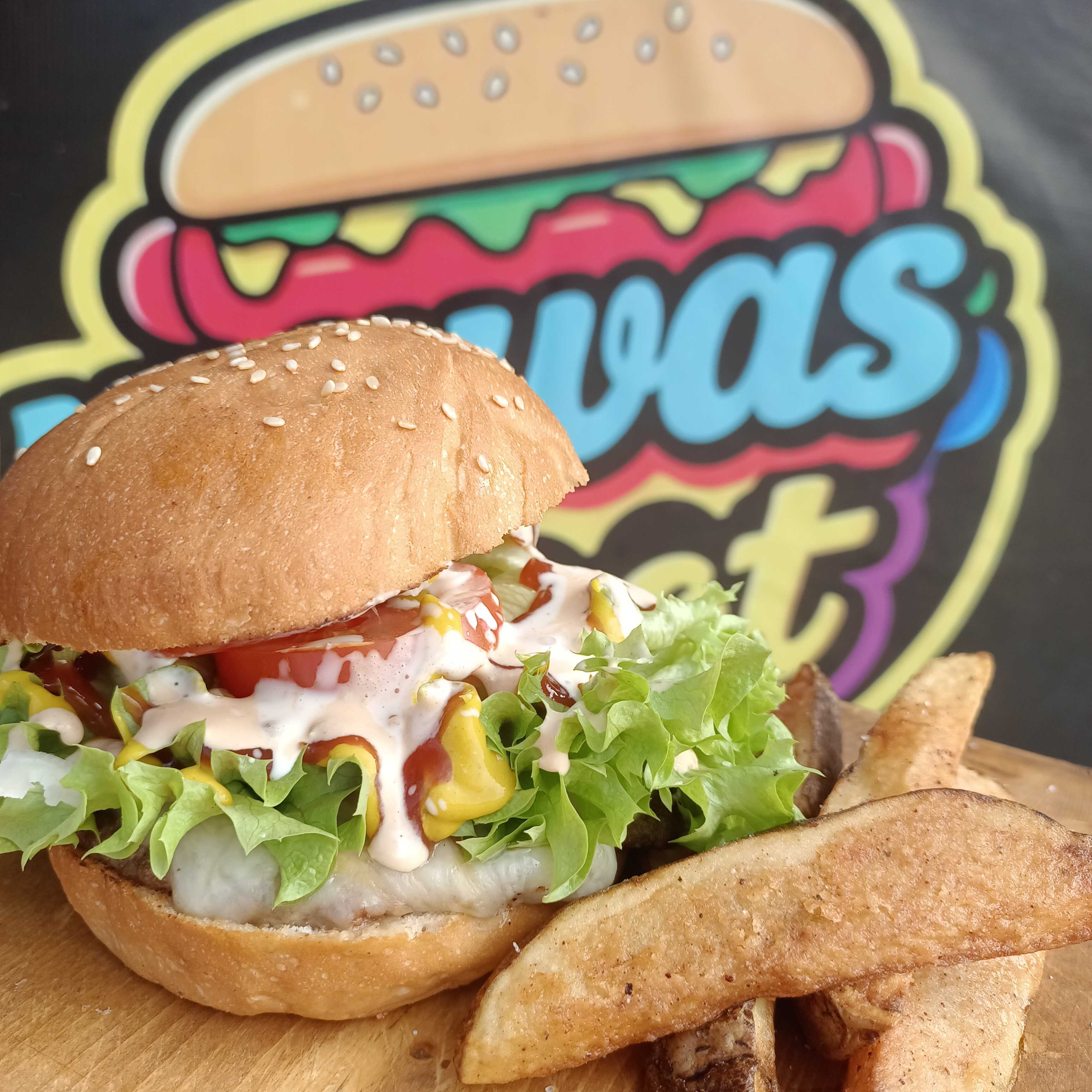 Carne con sazón de la casa, Pan hecho en casa, Pan hecho en casa, Lechuga, Tomate, Cebolla, Aderezo de la casa, Queso Chédar, Mayonesa, Acompañado de Papas Fritas