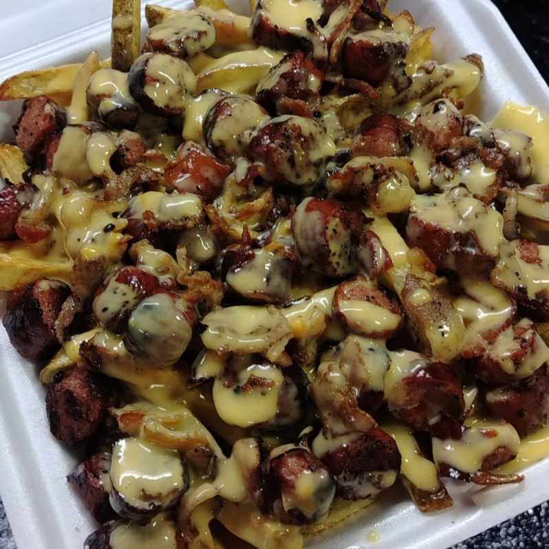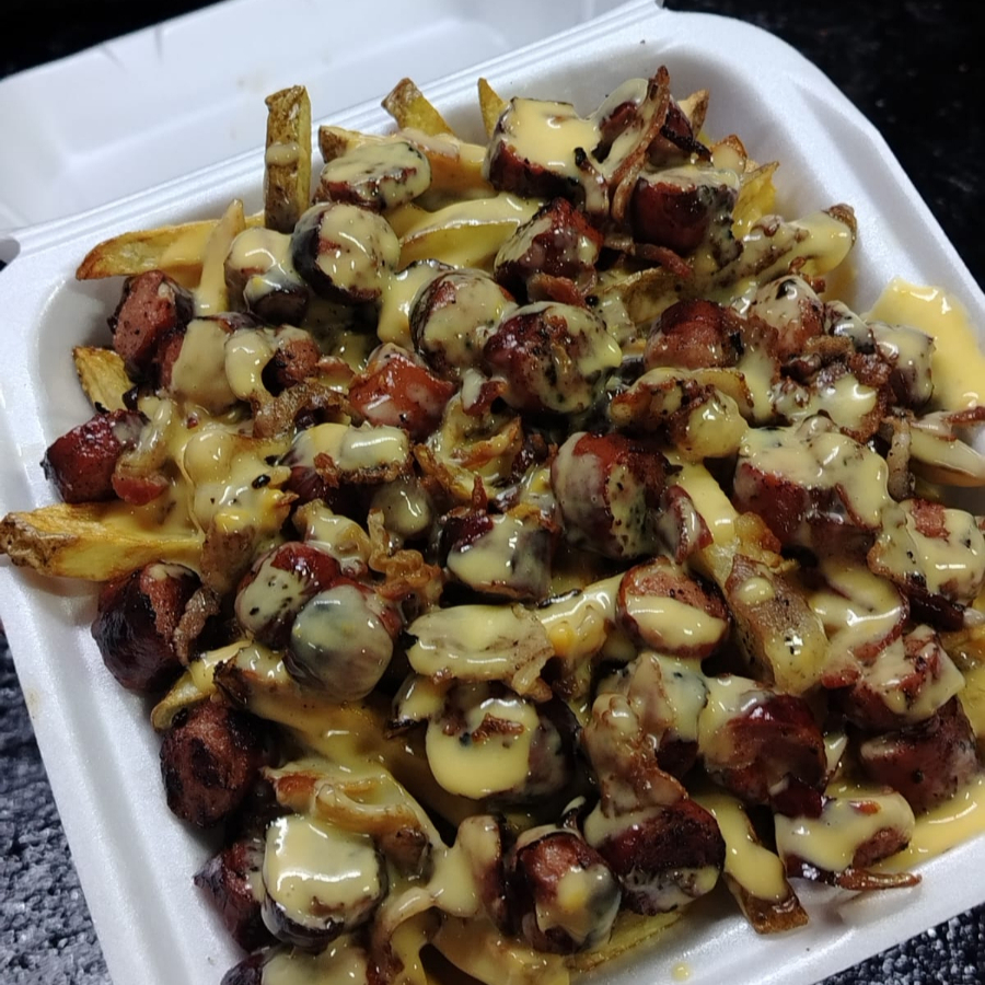 Orden y media de Papas Fritas, Bañado de Queso de Nacho, Queso Monterrey, Tocino, ChiliBeans, Mayonesa