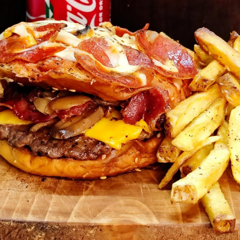 Carne sazón de la casa, Pan hecho en casa, Queso Chédar, Aros de cebolla, ChilliBeans, Tocino, Cebolla Caramelizada, Lechuga, BBQ, Aderezo de la casa, Mayonesa, Acompañado de Papas Fritas