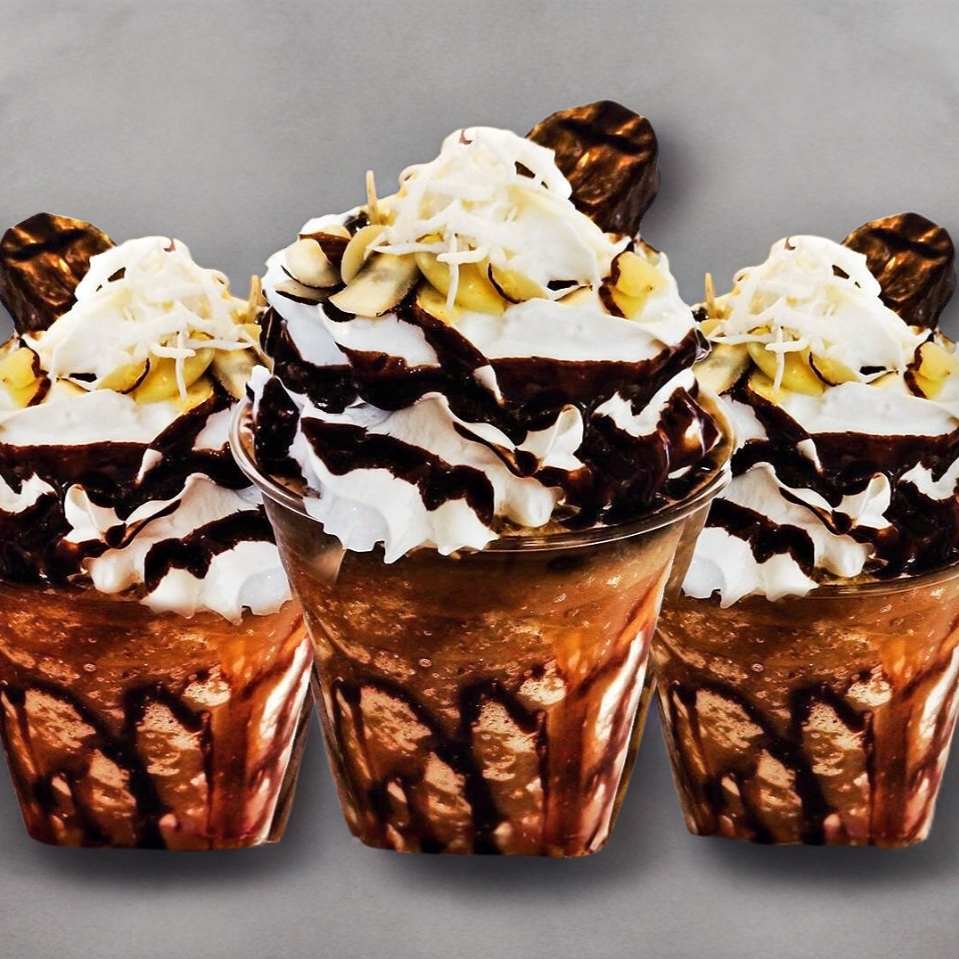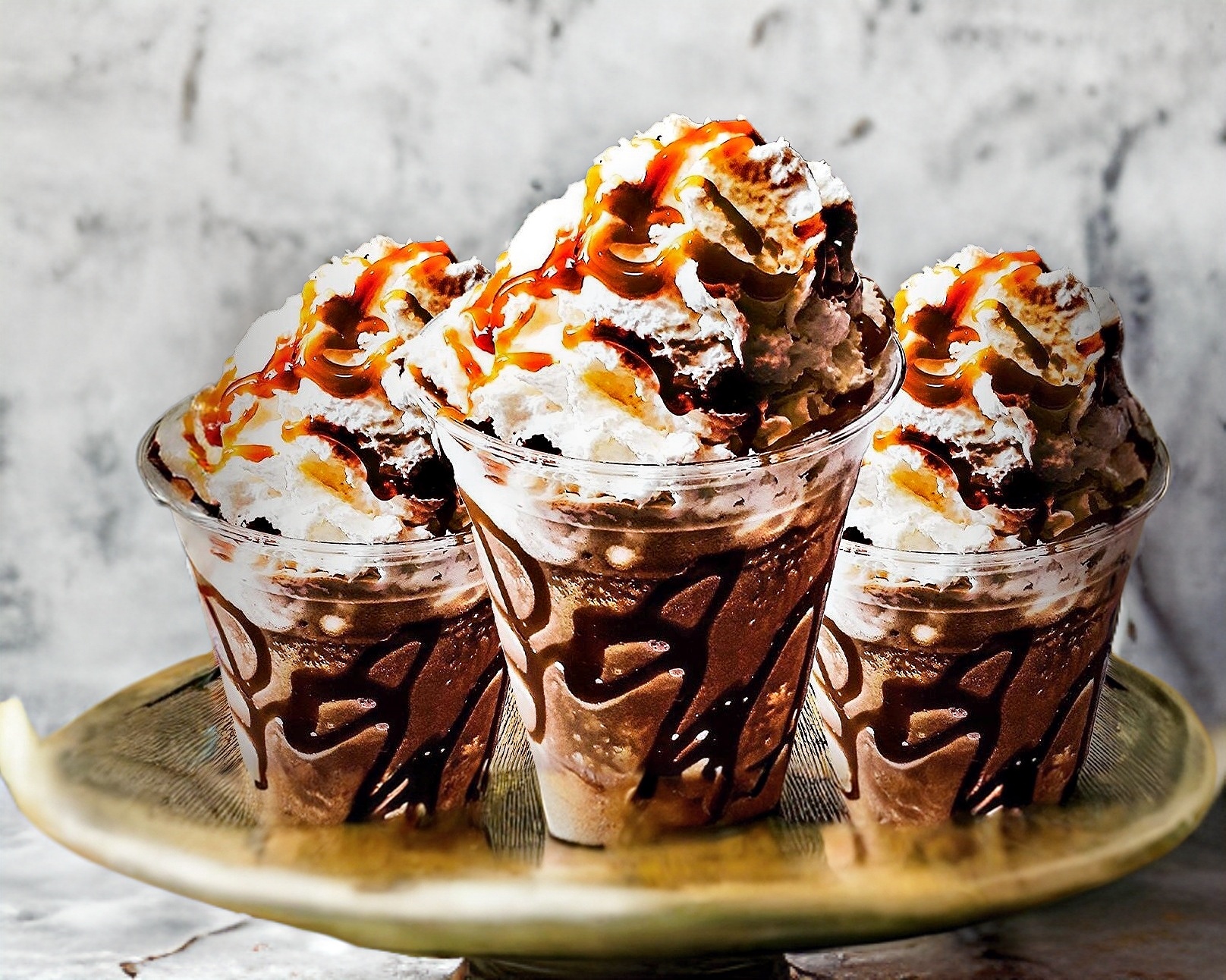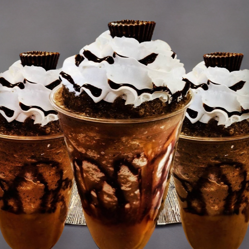 Café Espresso, leche, chocolate Reese's, caramel fudge, crema batida y hielo frappeado.