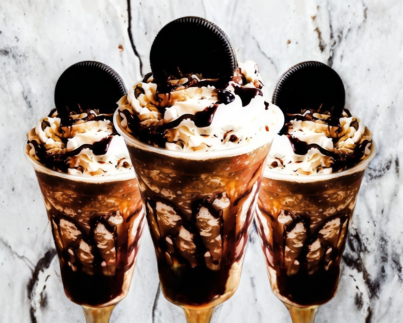 Café Espresso, leche, galletas Oreo y hielo frappeado.