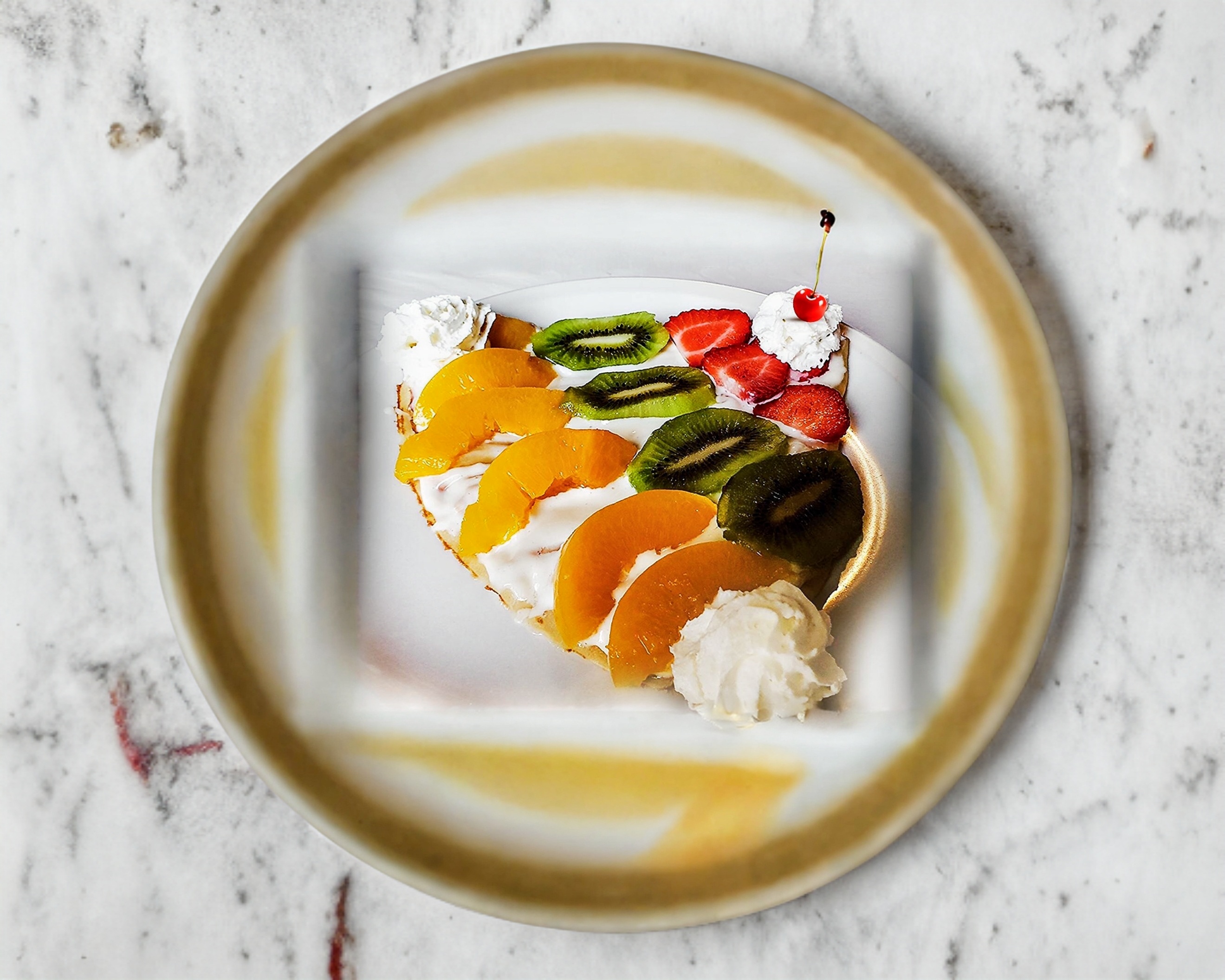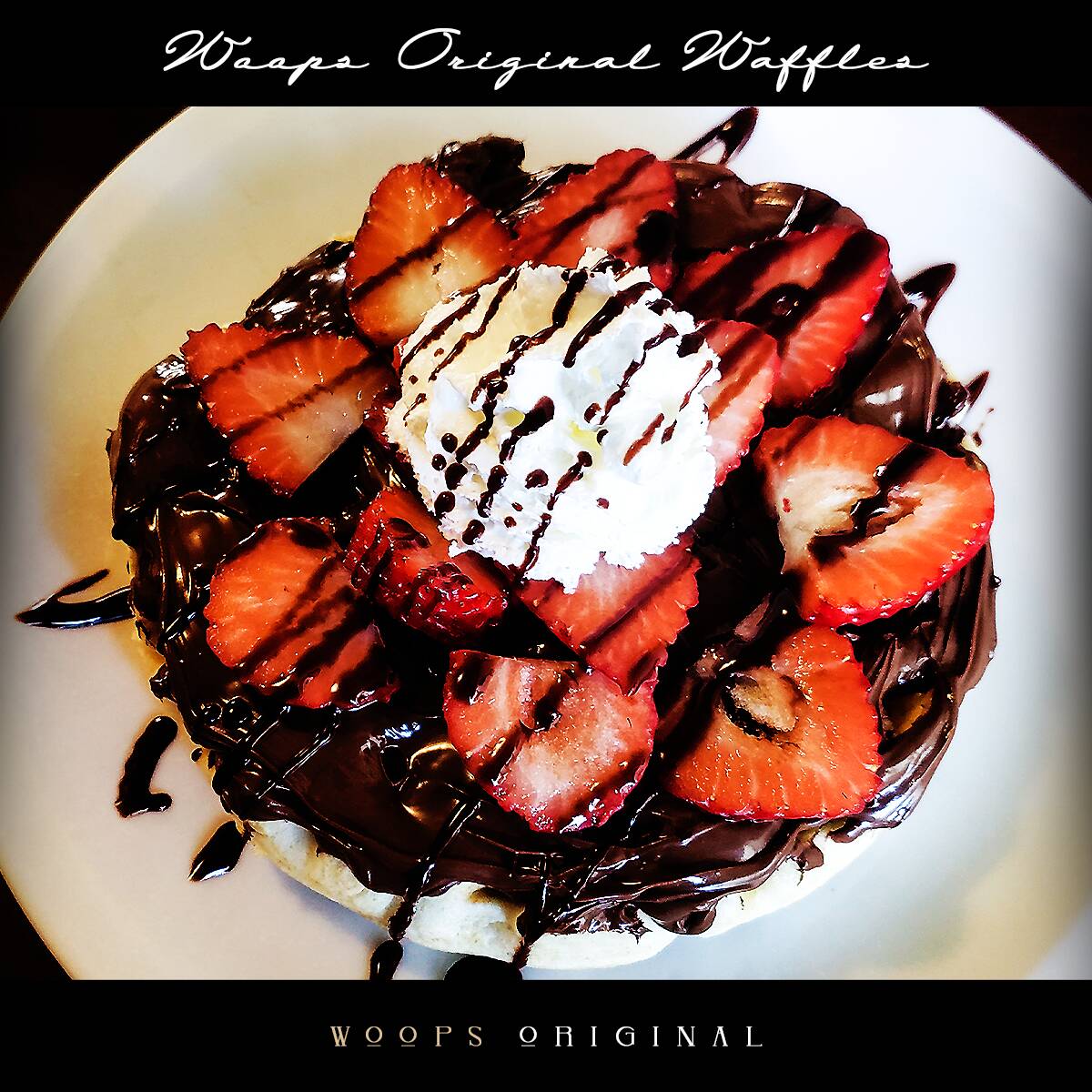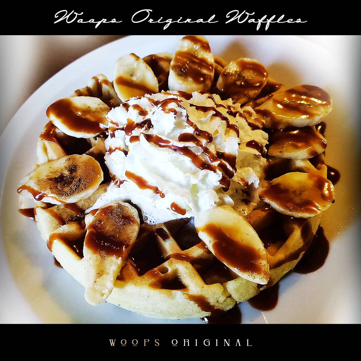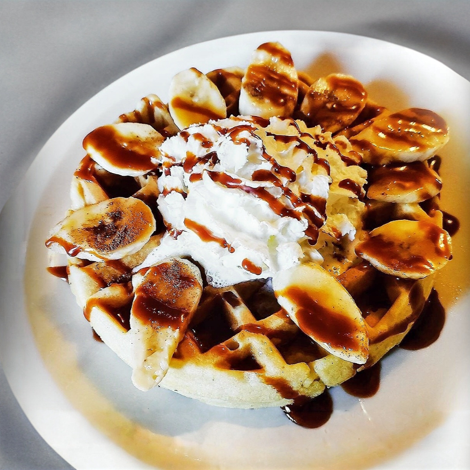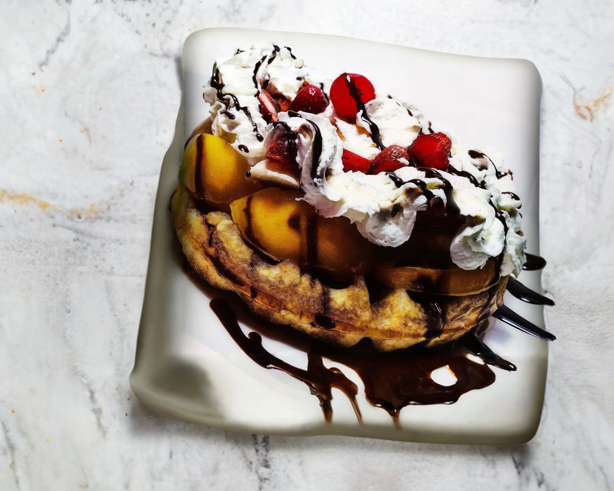 Waffle originario de las antiguas ferias de Bélgica; con fresa, plátano, durazno, mantequilla, maple, crema batida y chocolate líquido.