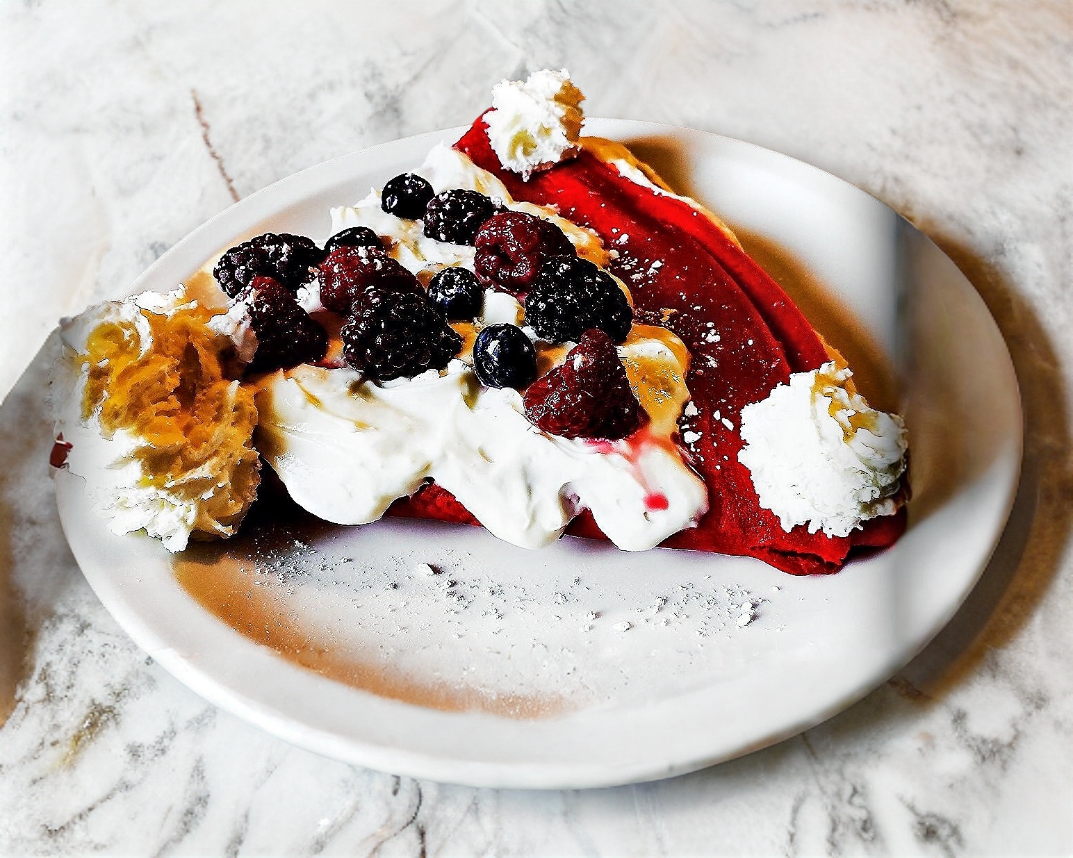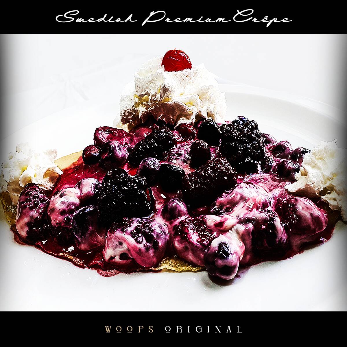 Crepa Roja Original estilo nórdica. Cubierta y rellena de un preparado especial a base de queso Philadelphia que balancea el sabor de los frutos rojos del bosque (fresa, frambuesa, mora, zarzamora y arándano). Incluye crema batida y azúcar glass.