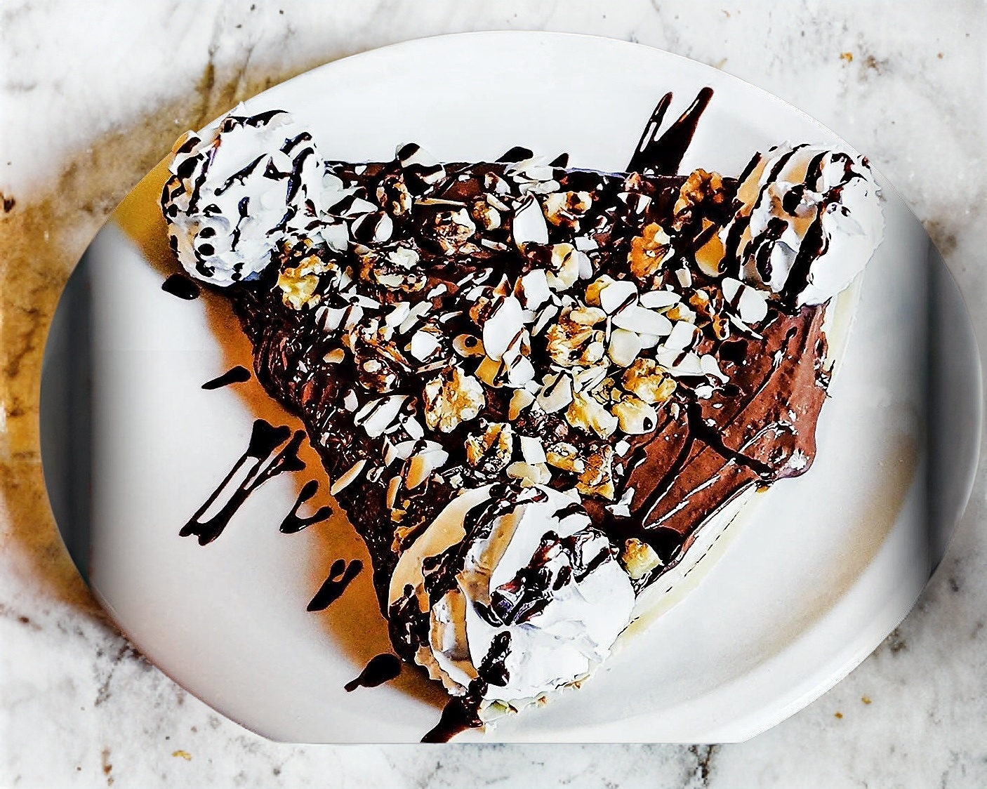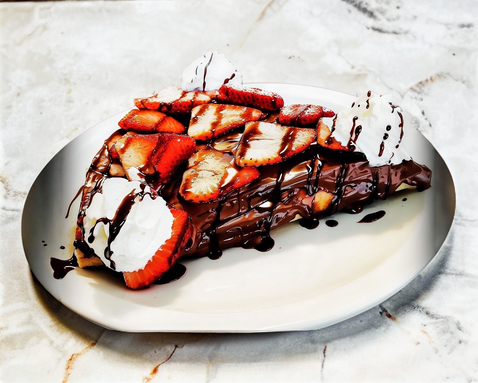 Receta francesa con un preparado a base de queso Philadelphia, Nutella, fresa, nuez, crema batida y chocolate Hershey's.