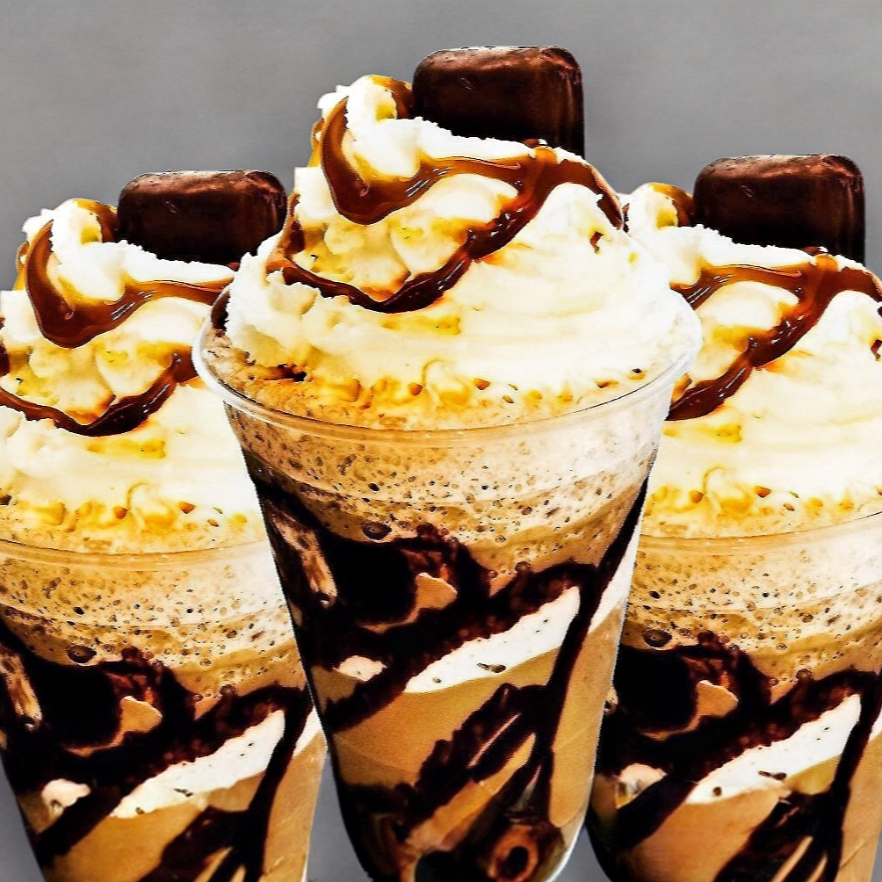Café Espresso, chocolate Snickers, caramel fudge, crema batida y hielo frappeado.